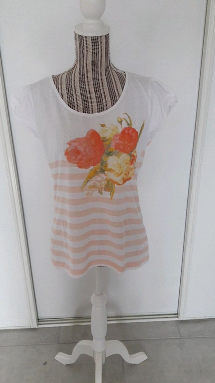 Tee shirt blanc motif fleurs et rayures abricot taille 3 tres bon état - photo numéro 1