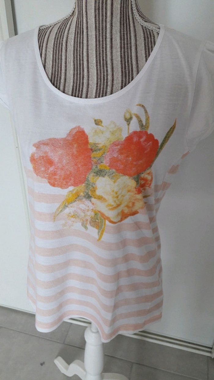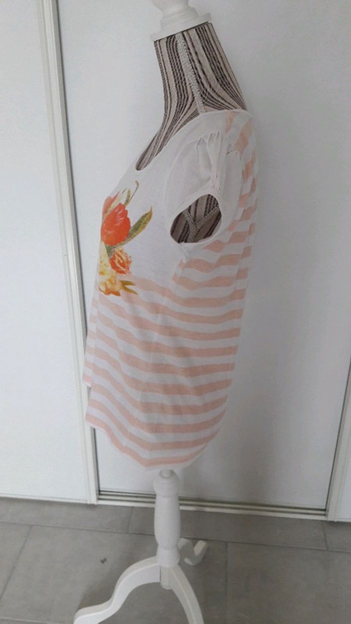 Tee shirt blanc motif fleurs et rayures abricot taille 3 tres bon état - photo numéro 5