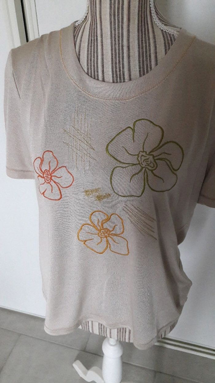 #42femmeamandine2386 Tee shirt femme Très bon etat L etiquette de la marque dans le cou a été enlevé (prix boutique 70e) taille 42 Beige brillant avec 1 fleur orange 1 verte 1 moutarde Fabriqué en france