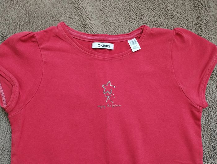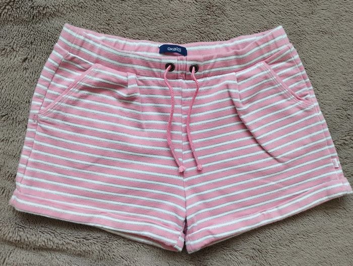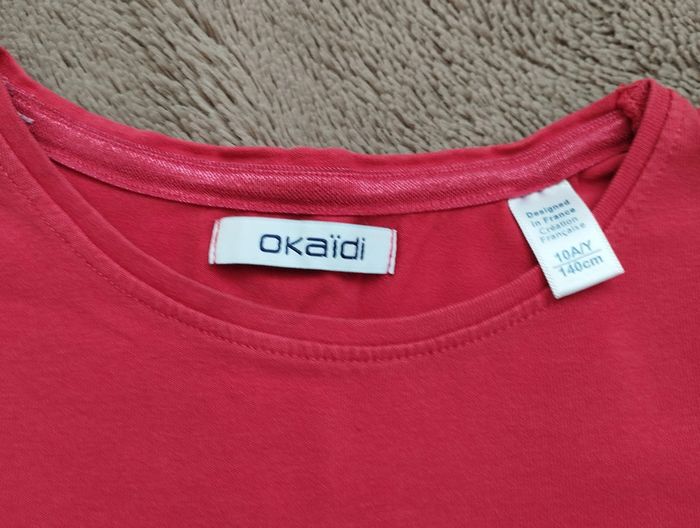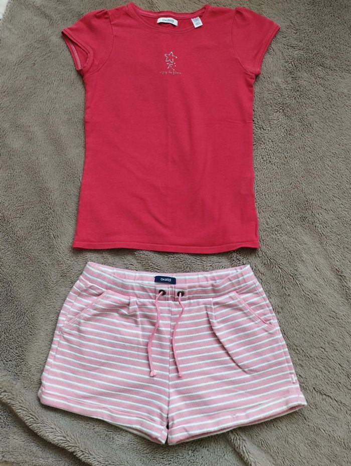 Ensemble composé d'un short neuf Okaïdi rayé rose et blanc avec des liserés argentés aux rayures, d un t shirt Okaïdi rouge très peu porté et d un t shirt rose jamais porté. #lae_bou_fille10ans
