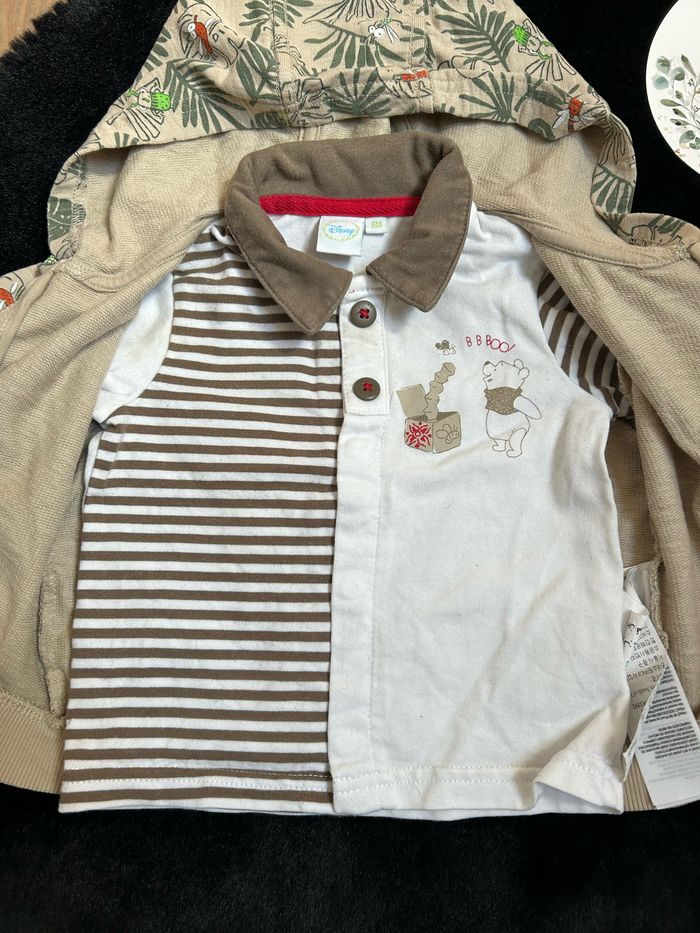 Ensemble Disney + veste DPAM de 3 pièces comprenant 1 veste zip à capuche beige à motif DPAM avec 2 poches + 1 polo manches longues Winnie (ouverture sur le devant) Disney + 1 pantalon à carreaux, taille élastique, 3 poches Disney Lot indissociable, le tout en parfait état, 6 mois 👍