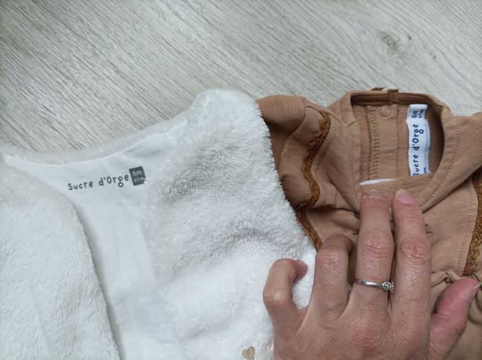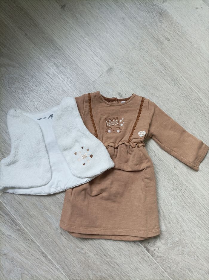 Ensemble robe manches longues de couleur caramel et son gilet blanc cassé sans manche Marque sucre d'orge en taille 6 mois. En excellent état, très peu porté