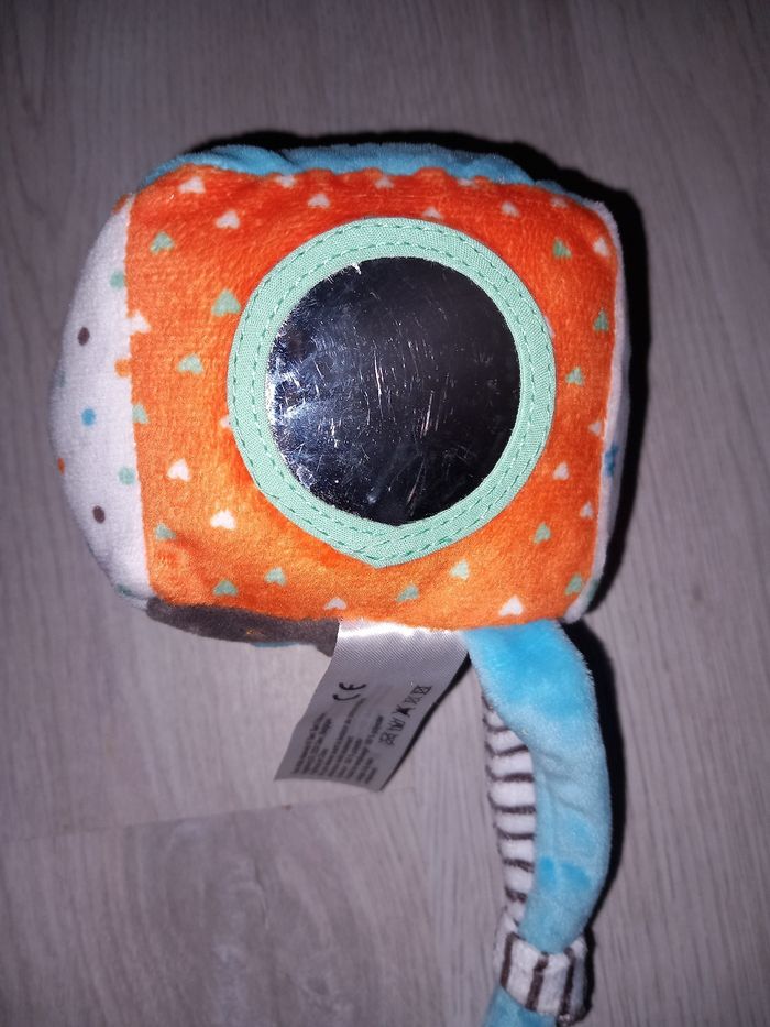 Cube d'éveil sur le lapin les oreilles ont une texture différente à celle du personnage, sur l'éléphant c'est son oreille, le miroir à quelques griffures, il y a des clochettes à l'intérieur. On peut l'attacher grâce aux Sangles. TBE pas de tâches pas de trous
