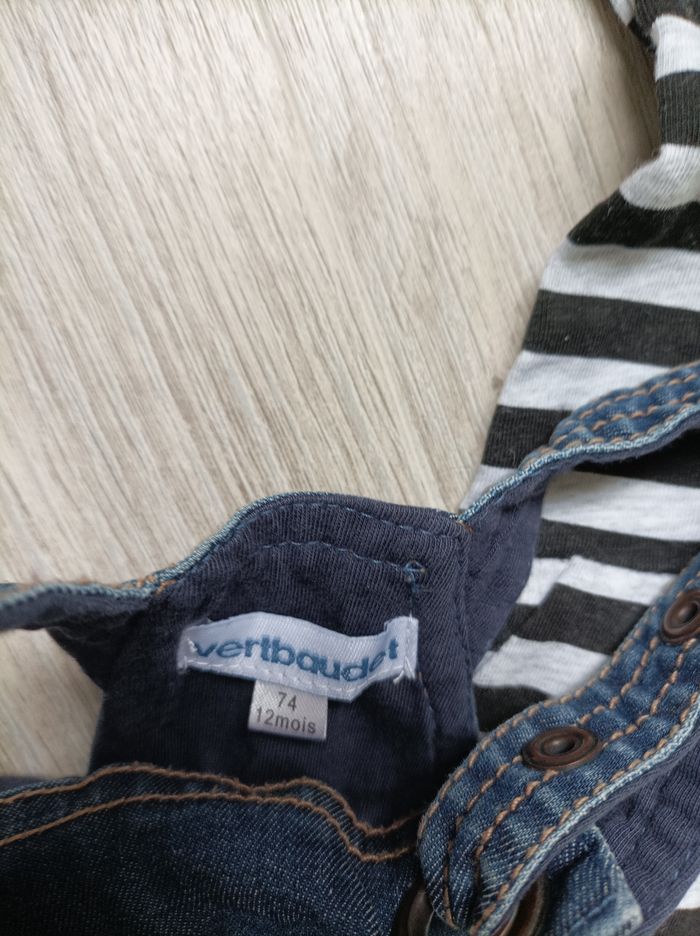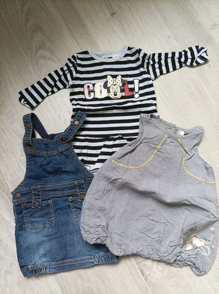 Lot de 3 robes Robe rayée noir et gris de marque Disney en 9 mois Robe grise sans manches en 9 mois Robe salopette en jean de marque Verbaudet en 12 mois