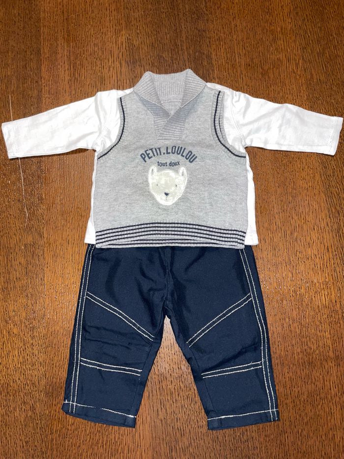Ensemble t-shirt manches longues + pantalon + pull sans manches Taille 3 mois Marque Gémo Sans étiquettes de taille et instructions de lavage