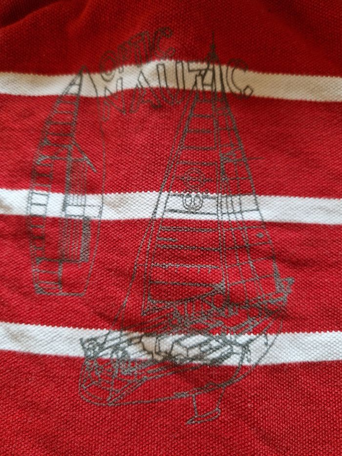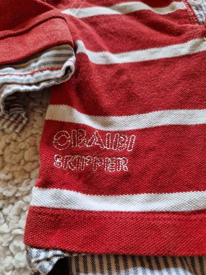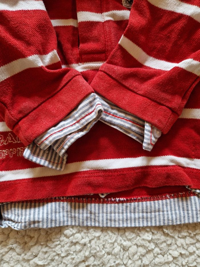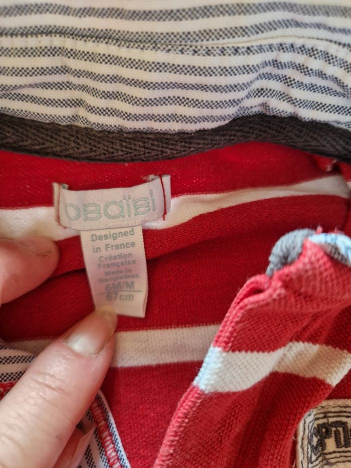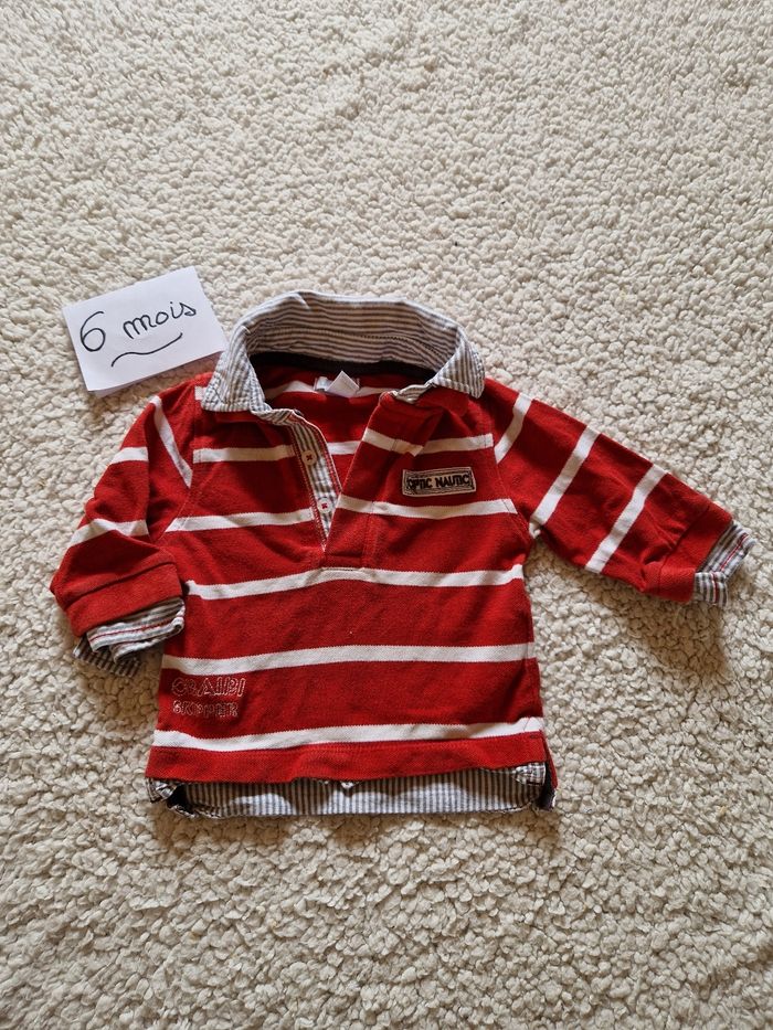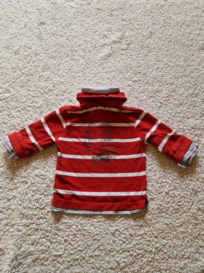 Polo à manches longues obaïbi 6 mois Rayé rouge et banc (n'est pas aussi vif que sur les photos) Motif marin avec voilier dans le dos Effet 2 en 1 Bon état : couleur ternie