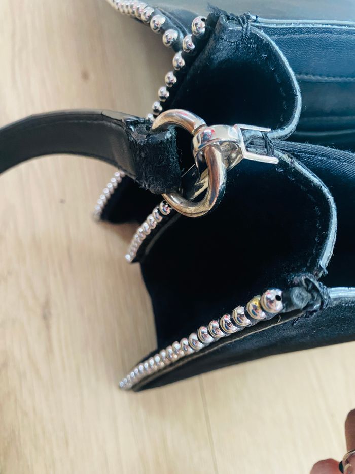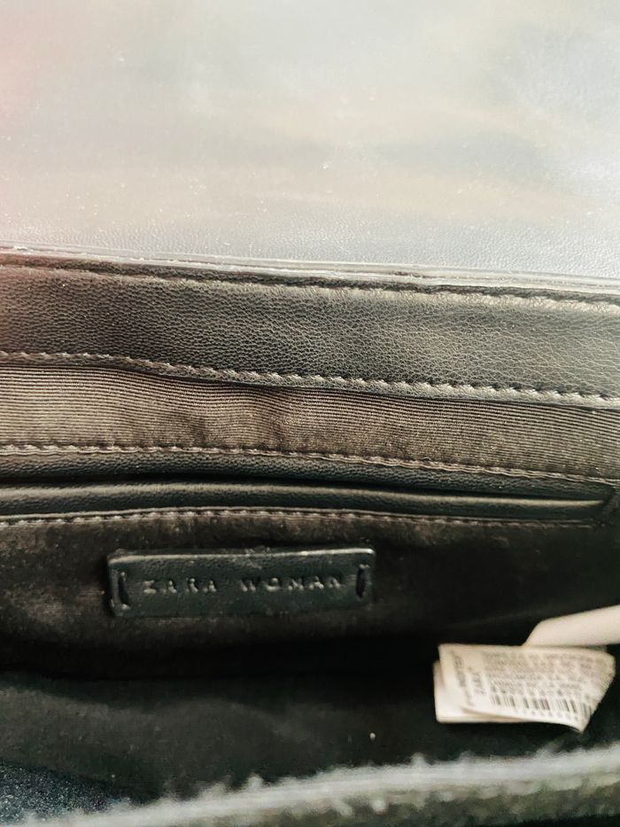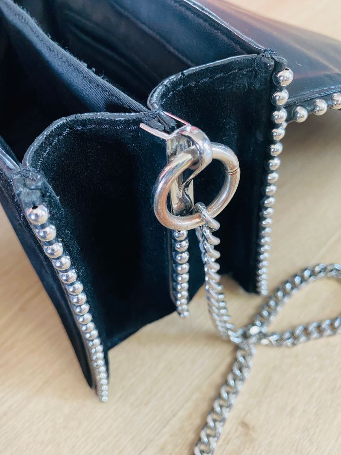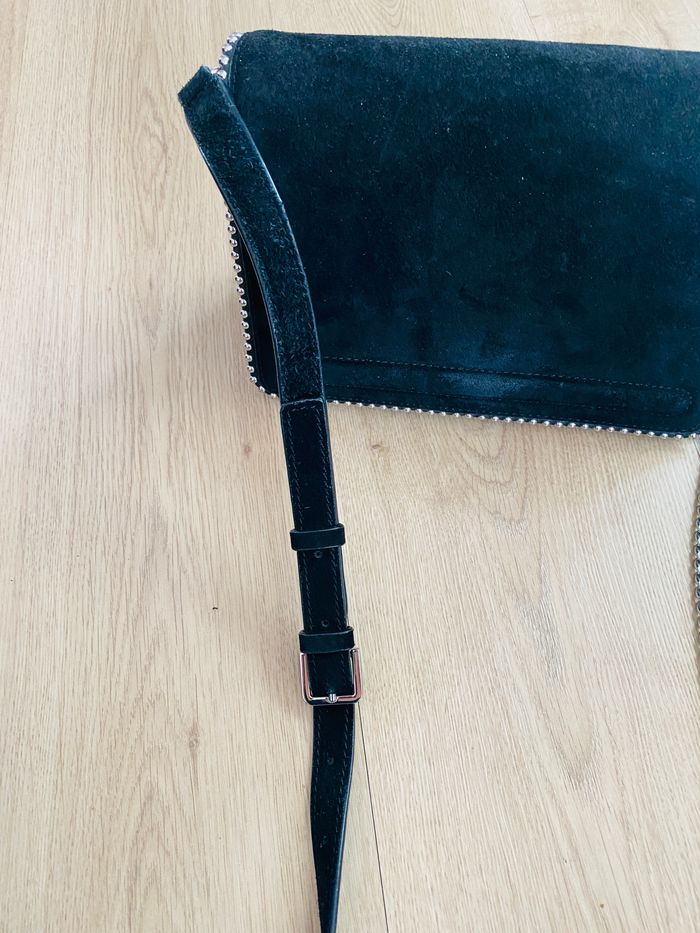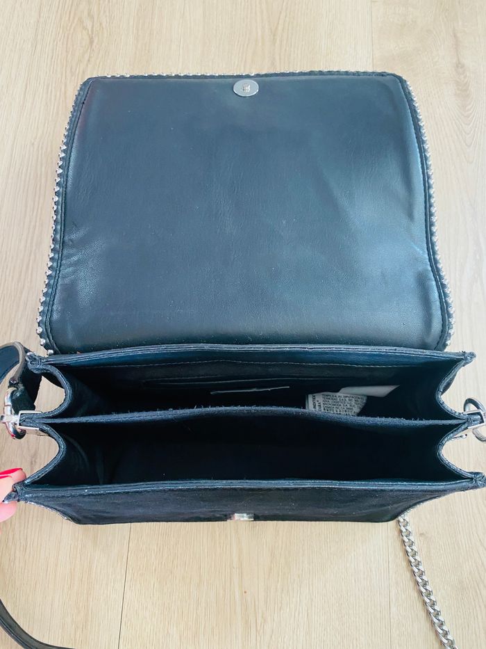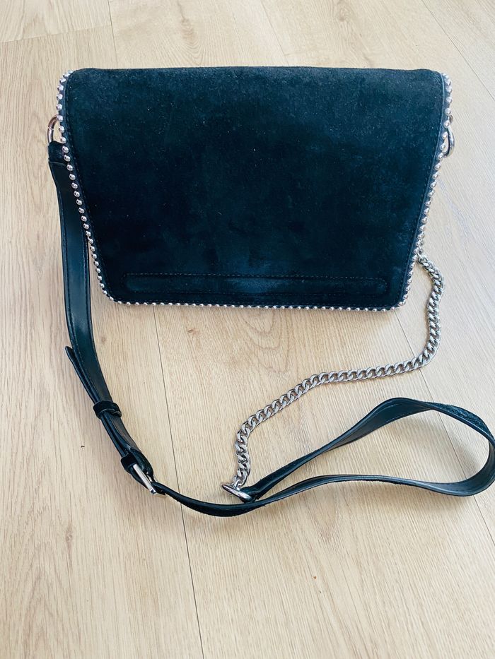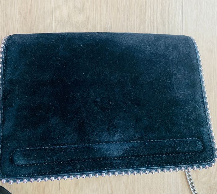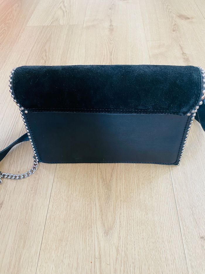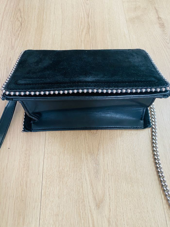 "Zara sac en daim noir avec chaine argenté peu etre porté en bandouilere ou à l'epaule fermerure aimanté perle en métal sur tout le contour du sac 2 pochette de rangement principal poche interieur utilisé mais bon état général pour lui donner une deuxieme vie"