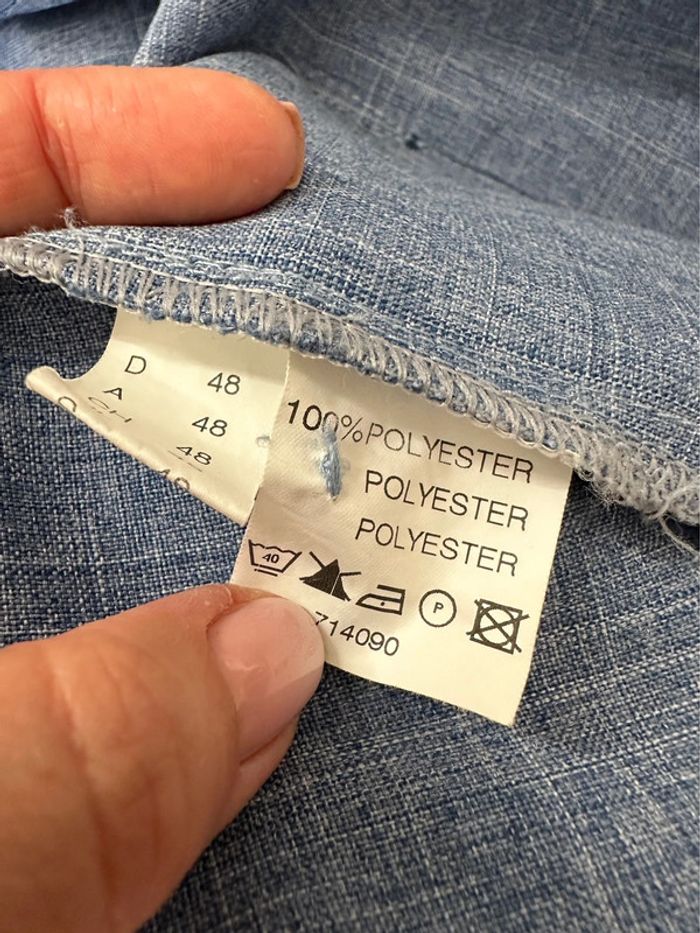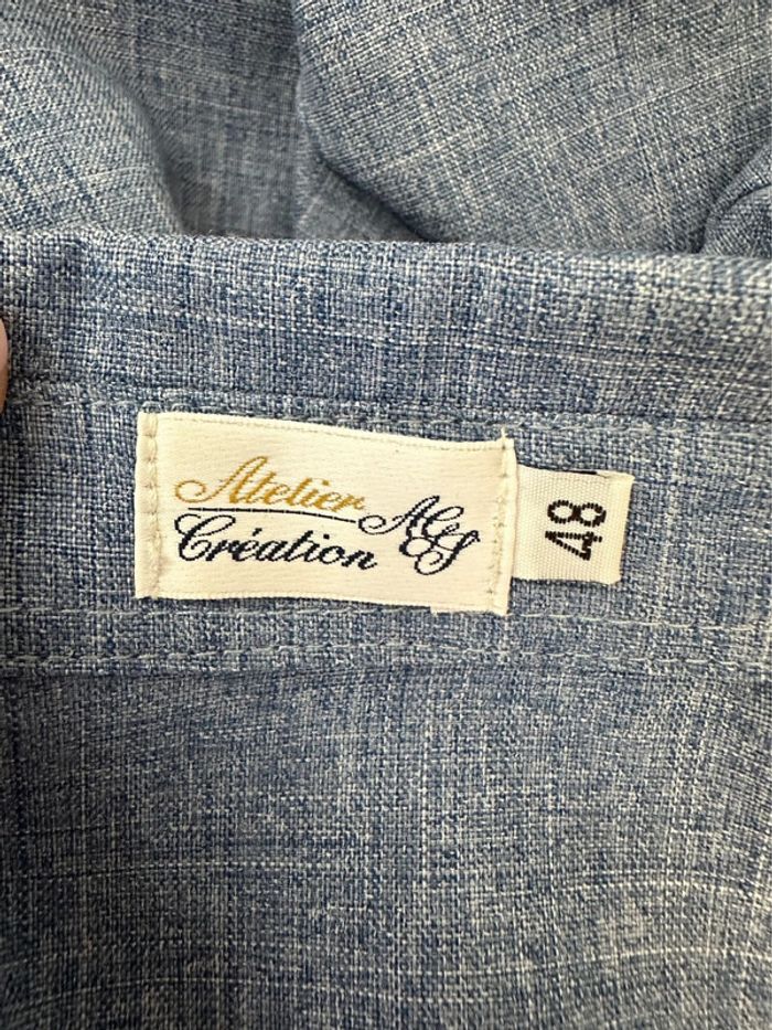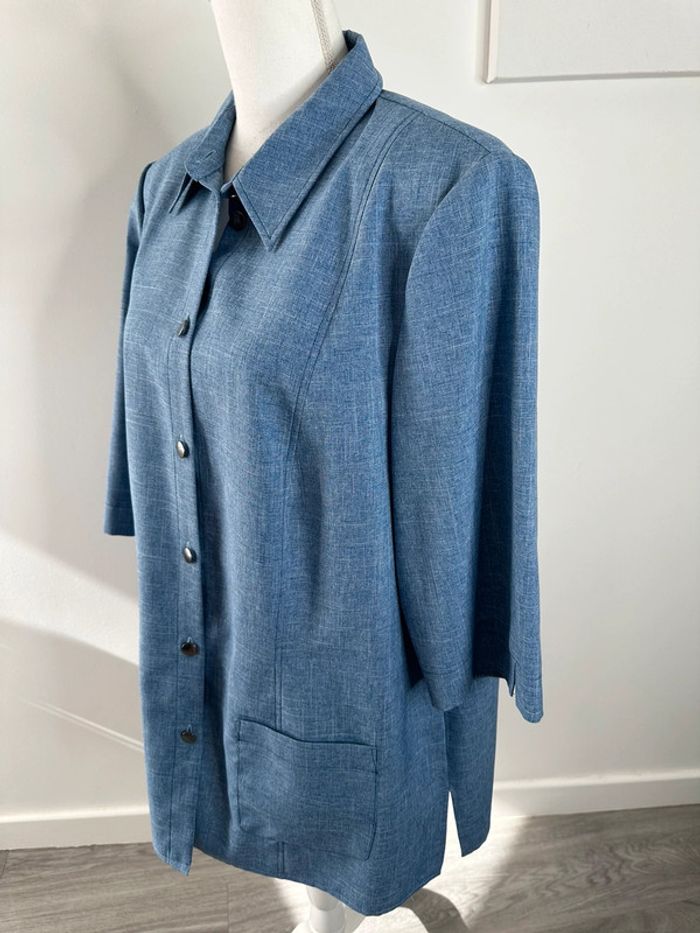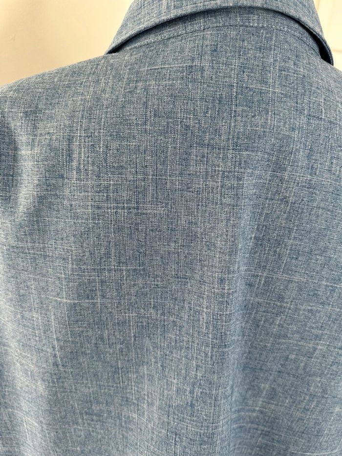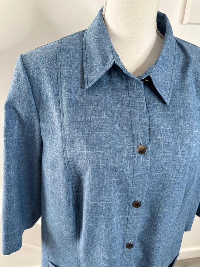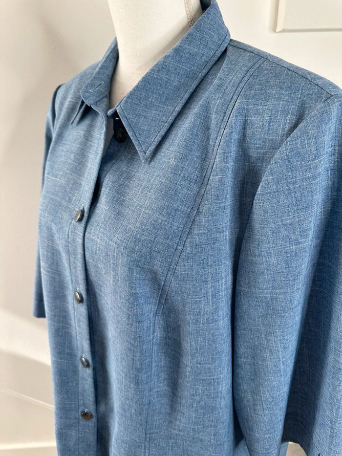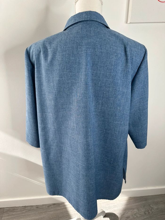 Blouse - Excellent état - Taille 48 équivalent 4XL - Bleue mouchetée - Manches courtes - Épaulettes (possibilité de les retirer) - Se ferme avec des boutons - Atelier Création Vintage, années 80’ - 100% Polyester