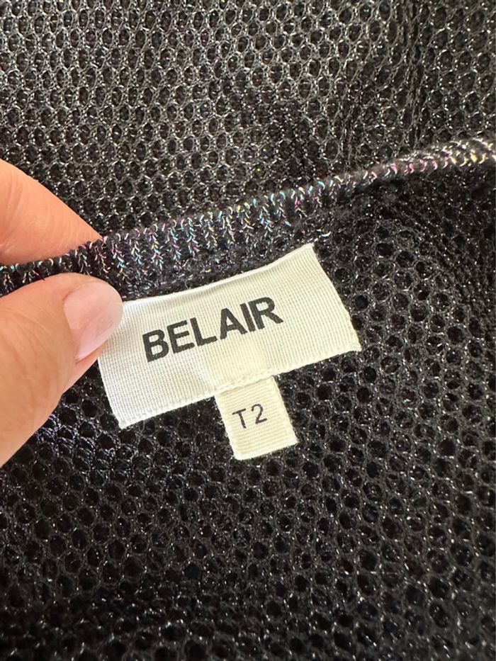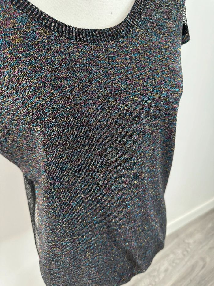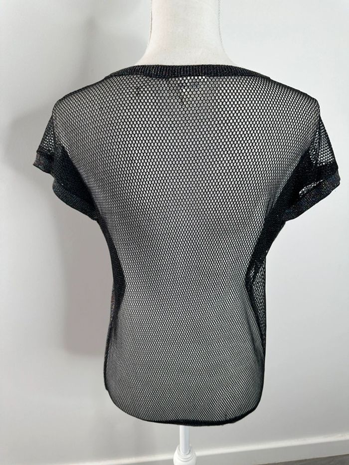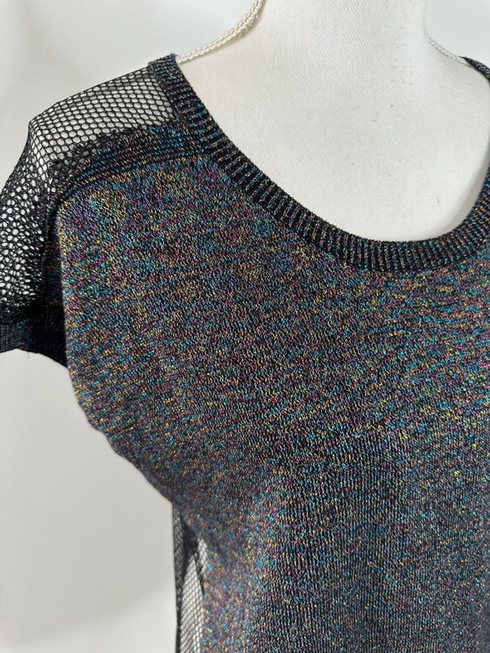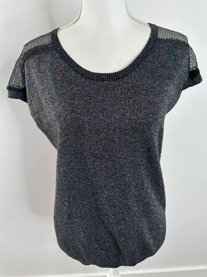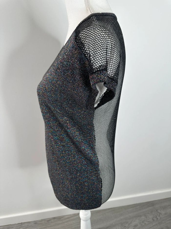Blouse - Excellent état - Taille 2 équivalent 38 M - Noir, argenté et multicolore pailleté - Résille ajourée dans le dos - Manches courtes - Marque Bel Air - Pas d’étiquette de matière