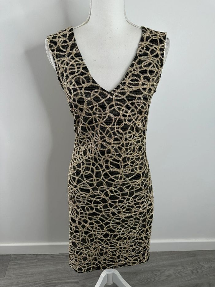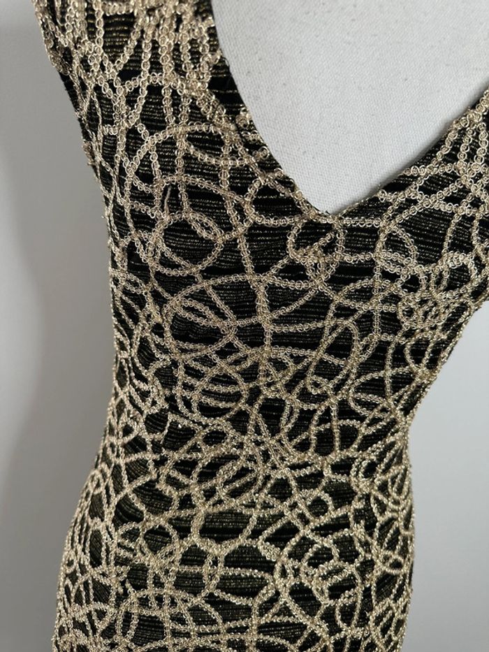 Robe - Excellent état - Taille 1 équivalent 36 S - Fille à suivre - Vintage, années 90’ - Noire et dorée - Coupe moulante - Sans manche - Col en V - Imprimés chaînes - Paillettes - Fabrication française 🇫🇷 - Polyamide, métal et élastane