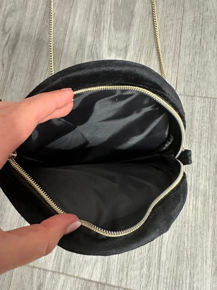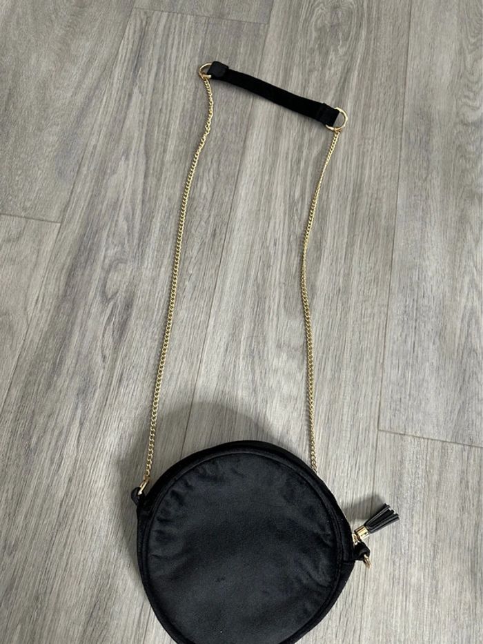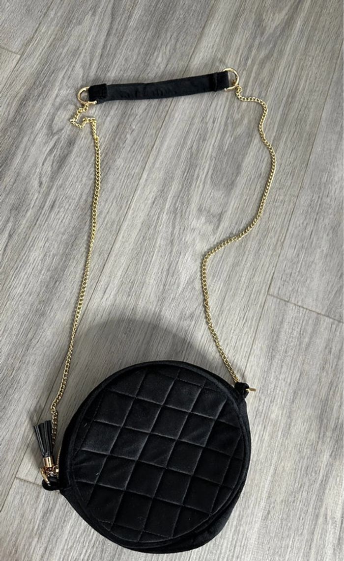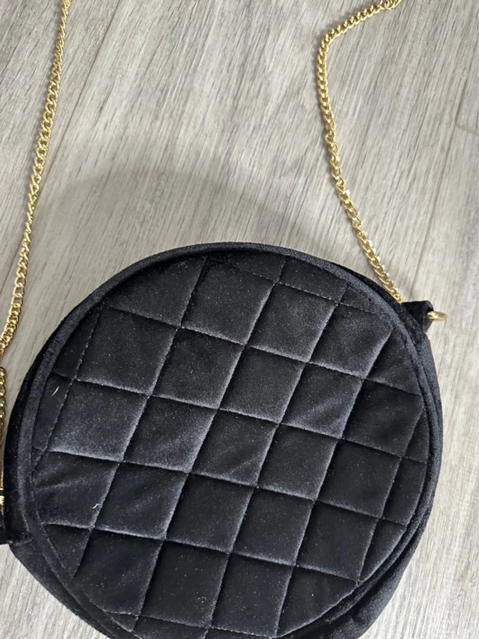 Sac - Excellent état - Noir et doré - Tissus velours - Effet matelassé - Chaîne dorée - Petit pompon - Se ferme avec un zip - 19cm de diamètre