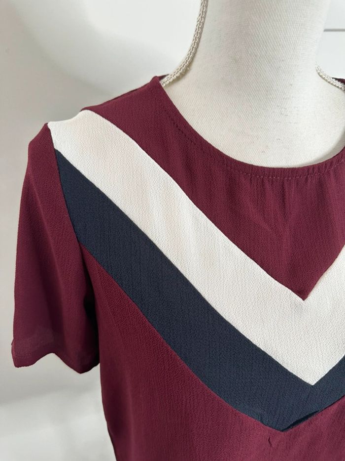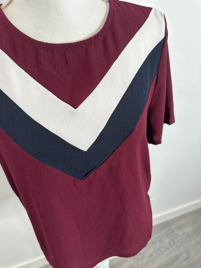 Blouse à manches courtes - Excellent état - Taille 38 équivalent M - Bordeaux, bleu marine et blanc - Tissus fluide - Women Only - Col rond - 100% Polyester