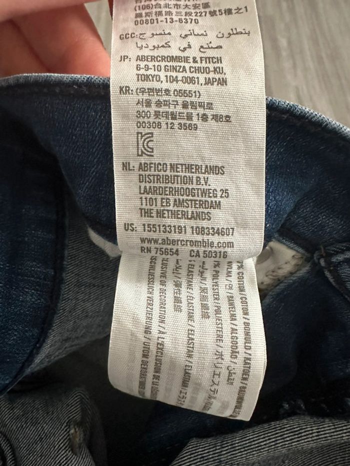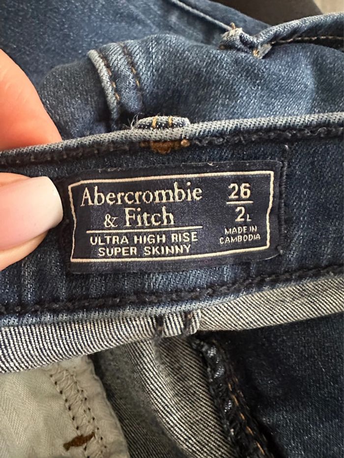 Jean denim - Excellent état - Taille 26 équivalent 36 S - Bleu délavé - Marque Abercrombie & Fitch - Modele Ultra high rise super skinny - Taille haute - Coton polyester et elastane Dimensions: - 32 à 36cm à la taille - 74cm entre jambe - 103cm de long