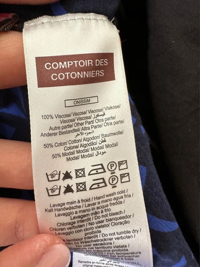 Robe - Excellent état - Taille 38 équivalent M - Comptoir des Cotonniers - Bleue marine et noire - Manches courtes - Doublure intérieure au niveau de la jupe - Fausses poches à l’avant - Liens à nouer au niveau de la nuque - Viscose, coton et modal