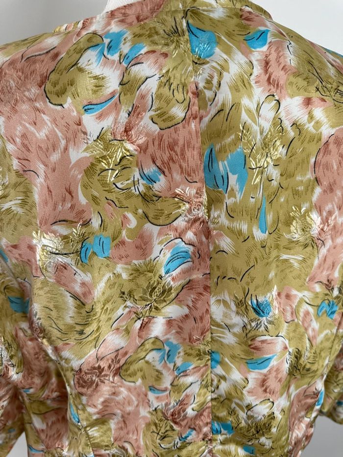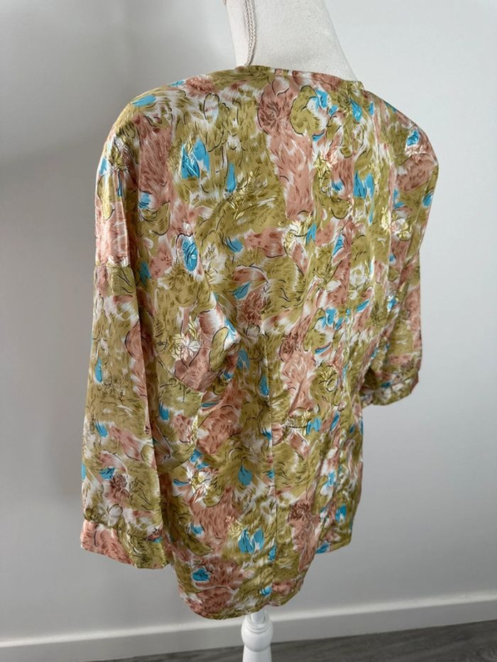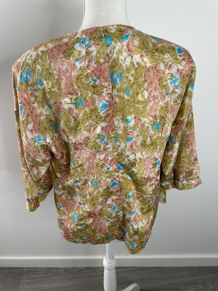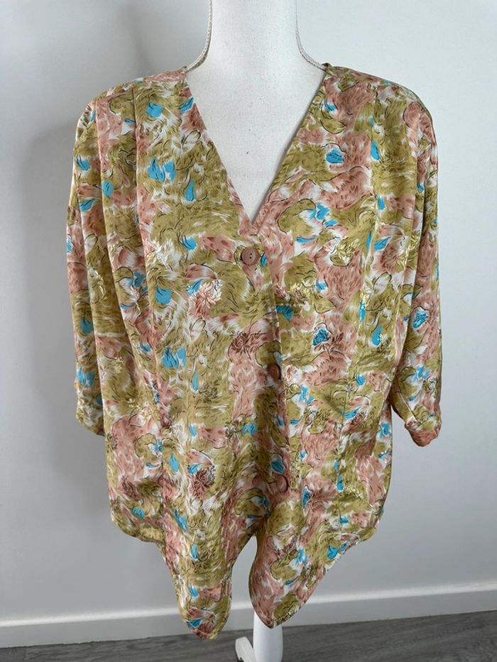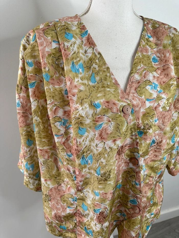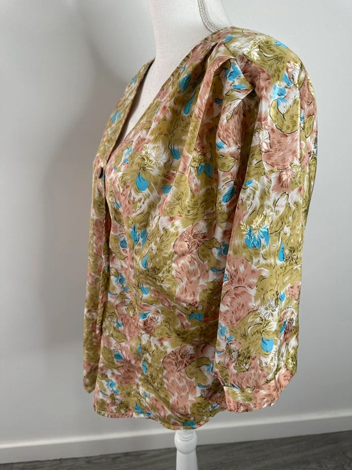 Blouse - Excellent état - Taille 48 équivalent 4XL - Manches 3/4 - Imprimés fleurs - Tissus fluide - Beige rose et bleue - Épaulettes (possibilité de les retirer) - Se ferme avec des boutons - Reflets satinés - Vintage, années 80’ - Plus d’étiquette de taille ni de matière Dimensions: - 60cm niveau aisselle - 63cm de long