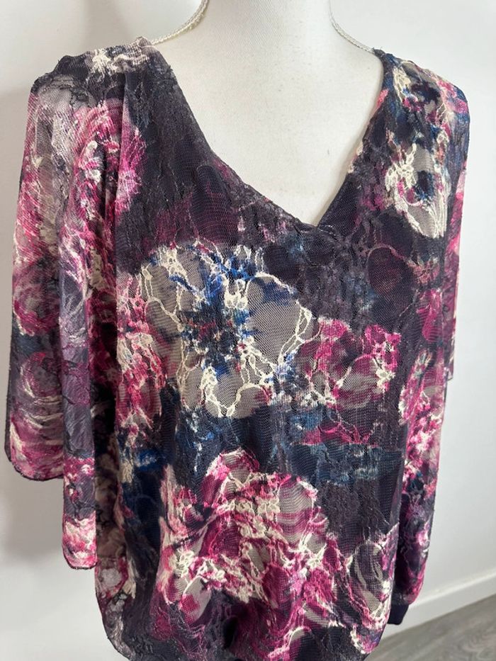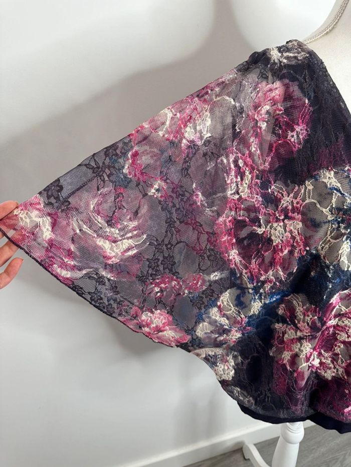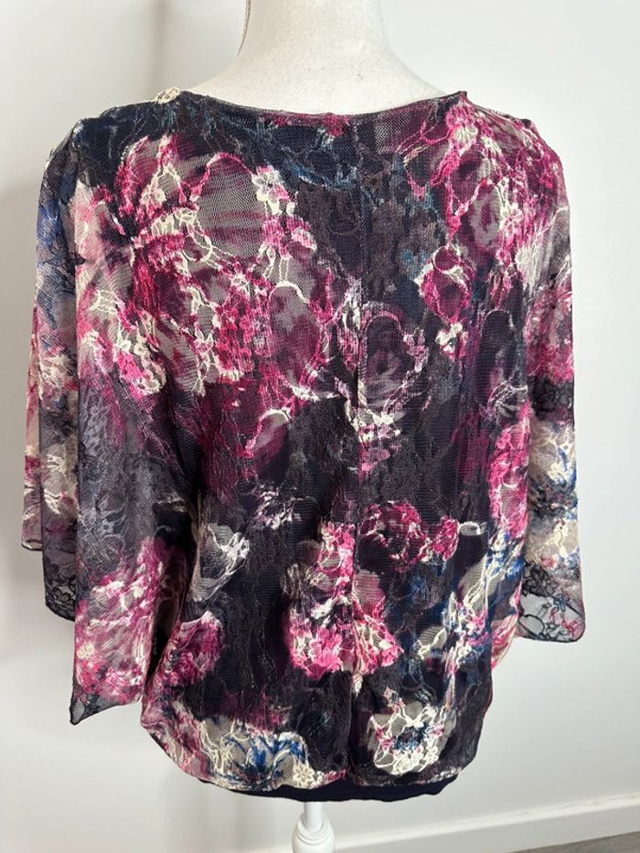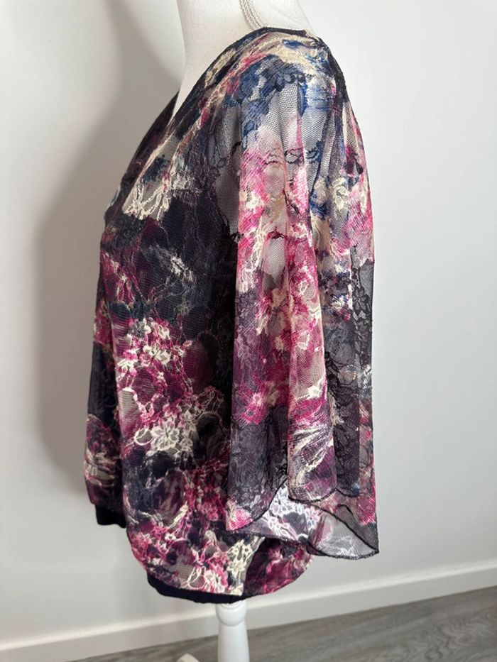 Blouse - Excellent état - Taille 40 équivalent L - Manches courtes chauve souris - Dentelle - Doublure intérieure au niveau du buste - Rose et violette - Manches transparente - Plus d’étiquette de taille ni de matière