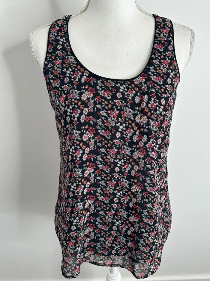Débardeur en mesh - Excellent état - Taille 38 équivalent M - Imprimés fleurs - Marque Pimkie - Doublure à l’avant - Transparent dans le dos - Noir et multicolore - Plus d’étiquette de taille ni de matière - Tissus mesh résille
