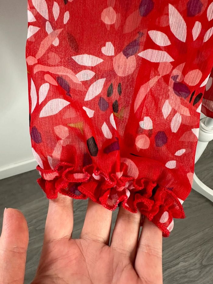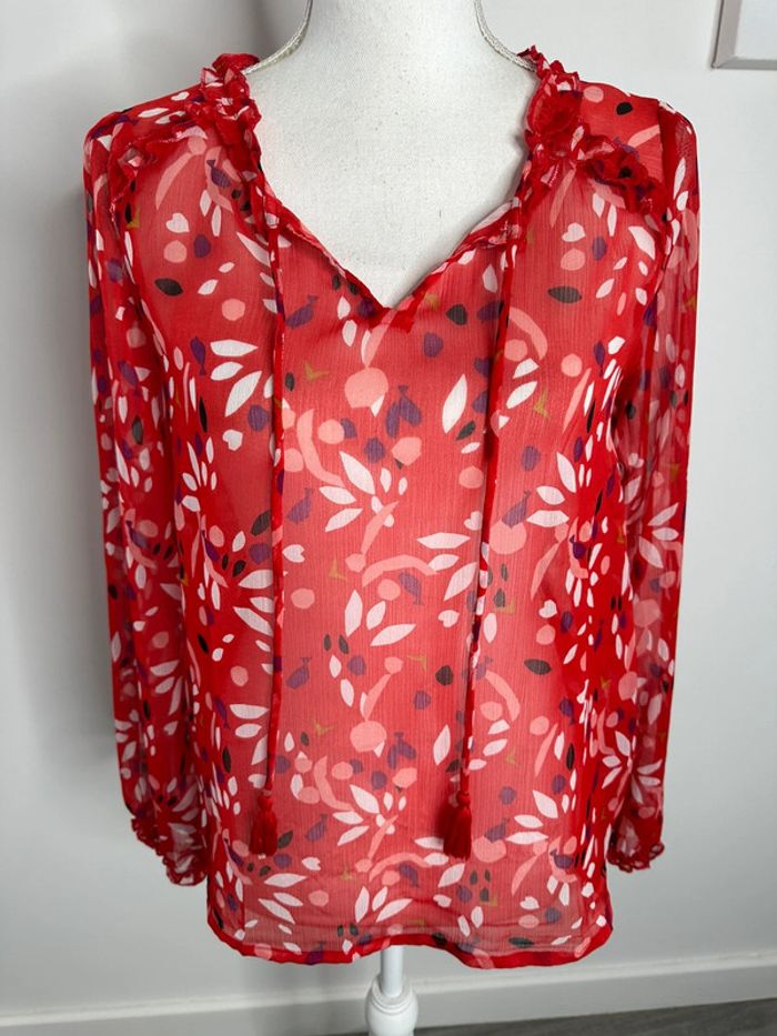 Blouse transparente - Excellent état - Taille 36 équivalent S - Miss by Captain Tortue - Rouge et multicolore - Manches longues - Imprimés style fleurs - Liens à nouer au niveau du col - 100% polyester - À porter avec un débardeur ou avec un maillot de bain