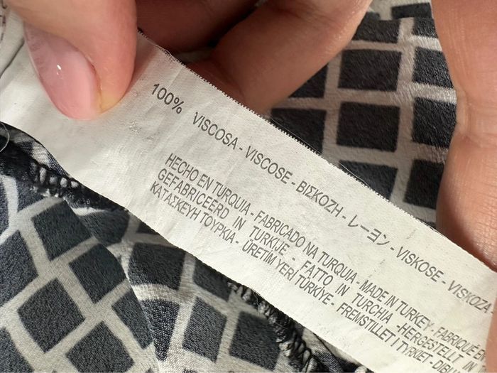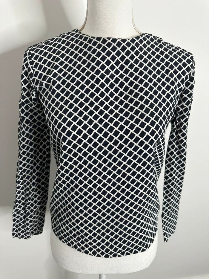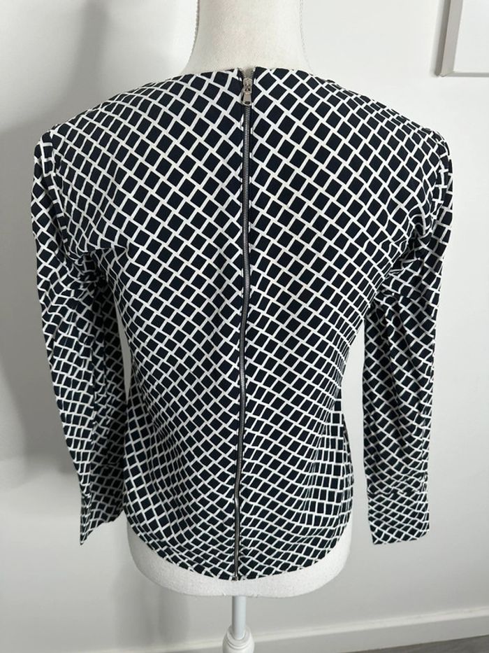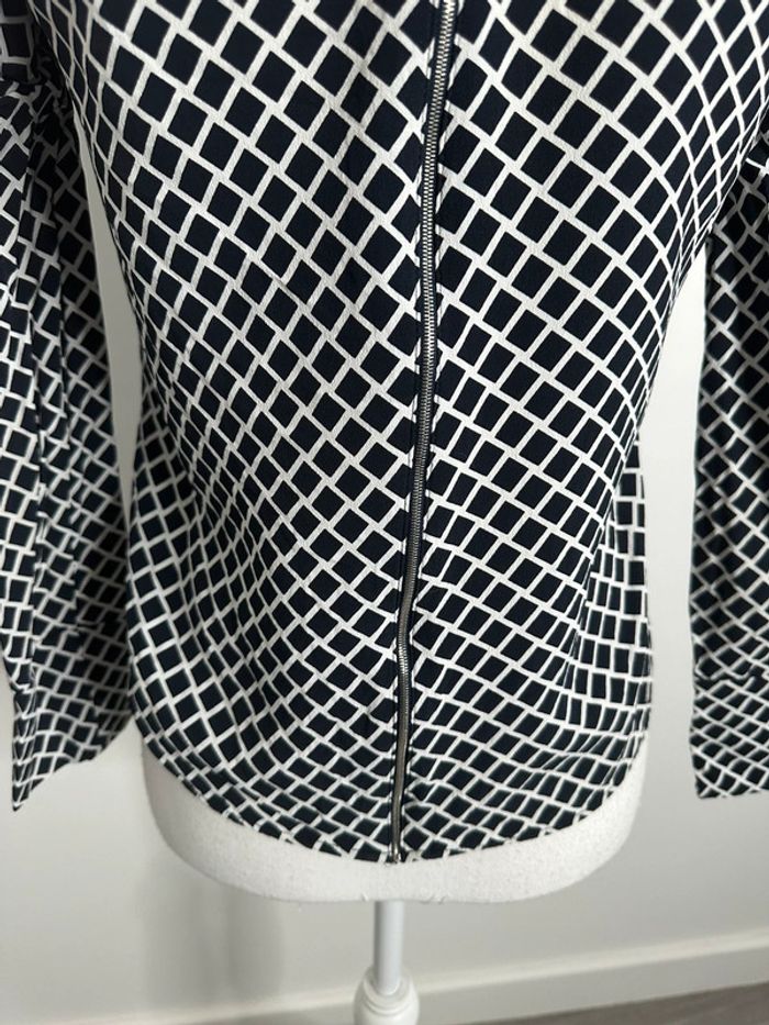 Blouse géométrique - Excellent état - Marque Zara - Taille 34 équivalent XS - Bleue marine et blanche - Imprimés petits carrés géométriques - Long zip dans le dos - 100% Viscose