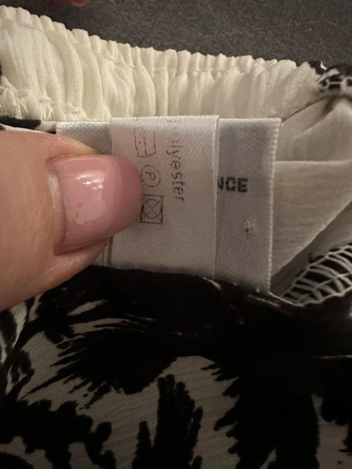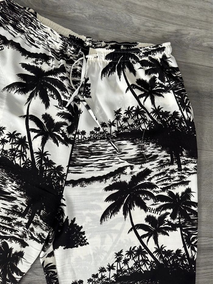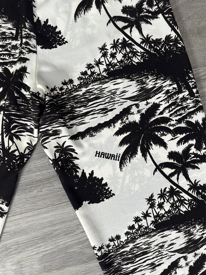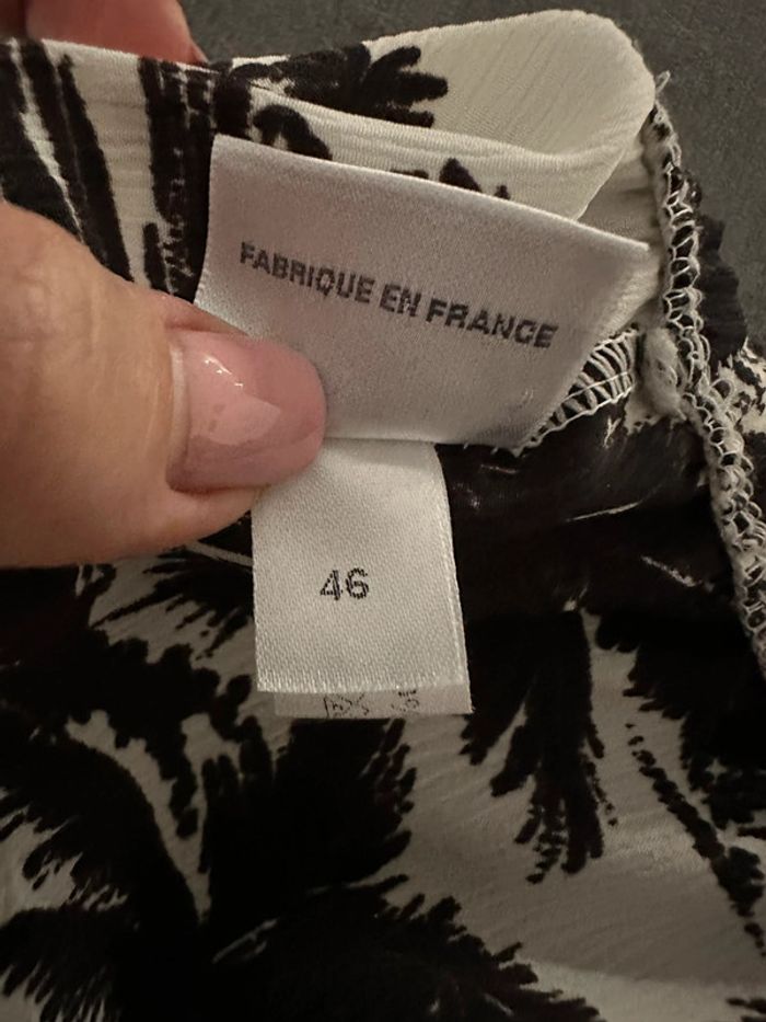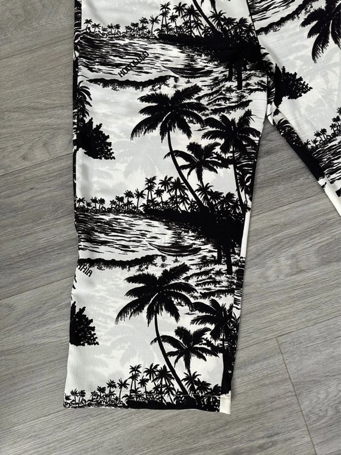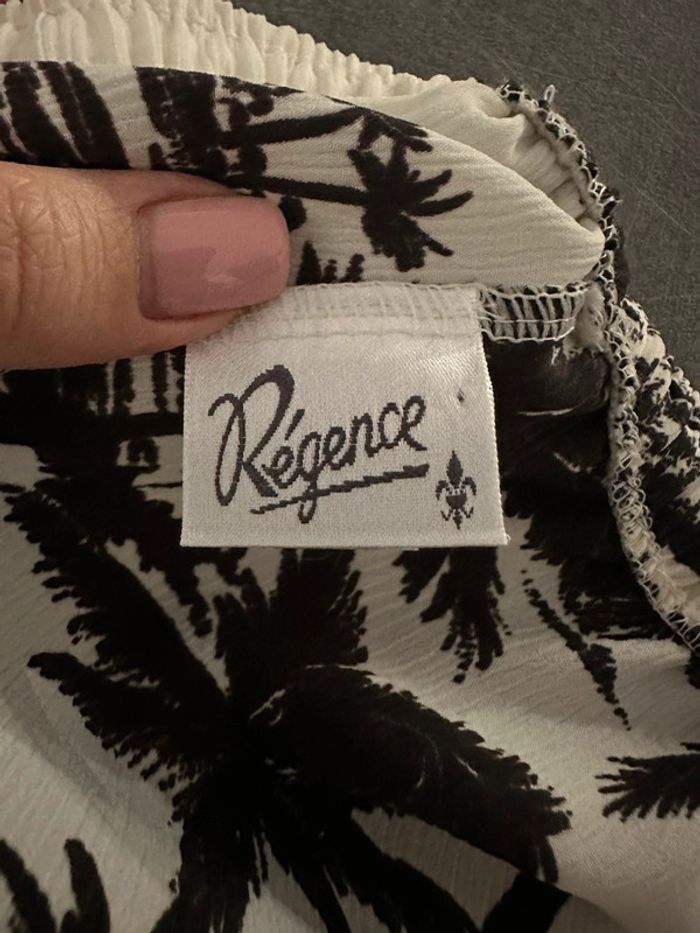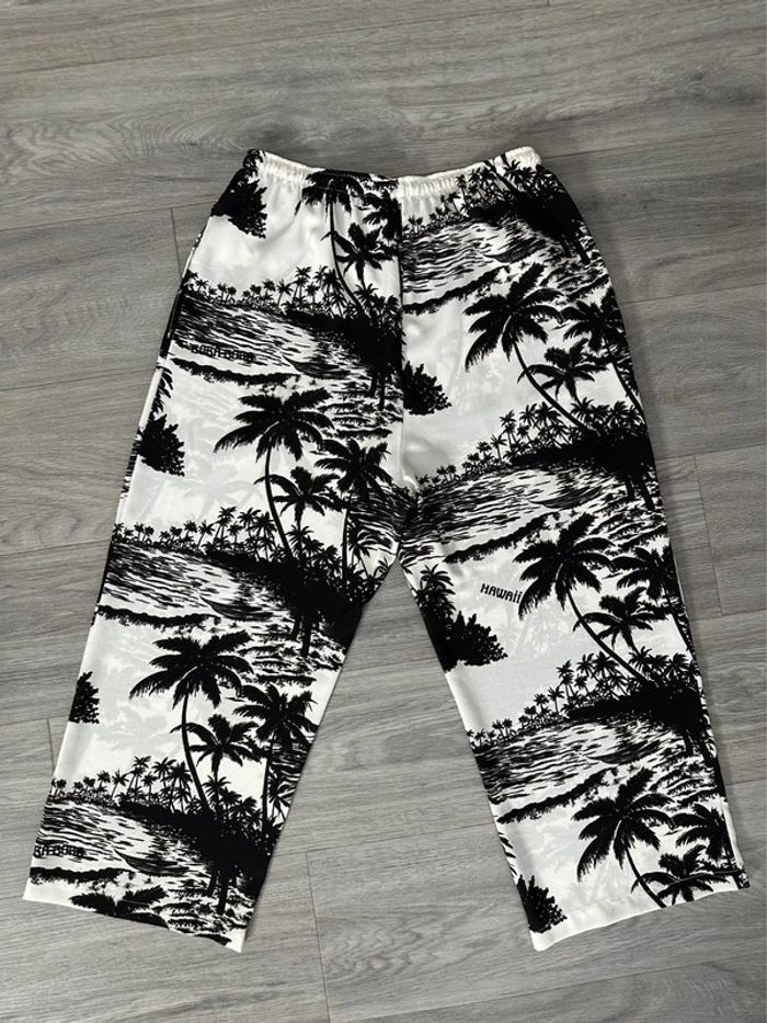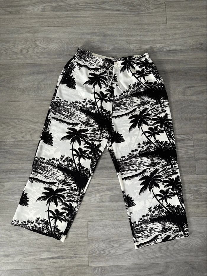 Pantacourt tropical - Excellent état - Taille 46 équivalent 3XL - Blanc et marron très foncé, presque noir - Tissus fluide - Jambes larges - Imprimés palmiers tropicaux - Marque Régence Vintage - Fabrication française 🇫🇷 - Légèrement transparent - Élastique et lien à la taille - Deux poches - 100% Polyester Dimensions: - 38 à 52cm à la taille - 56cm entre jambe - 92cm de long