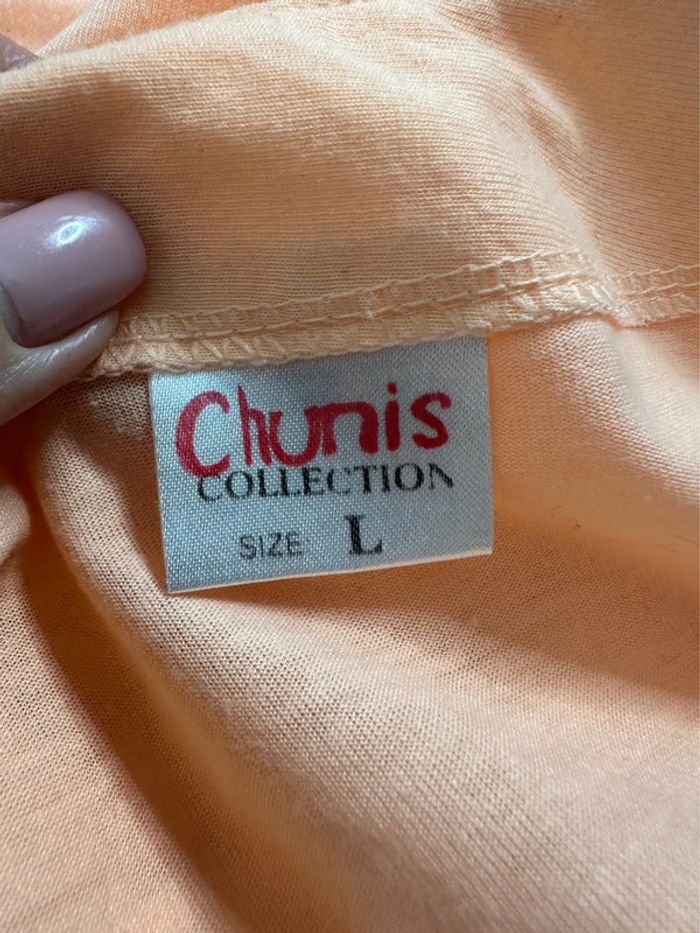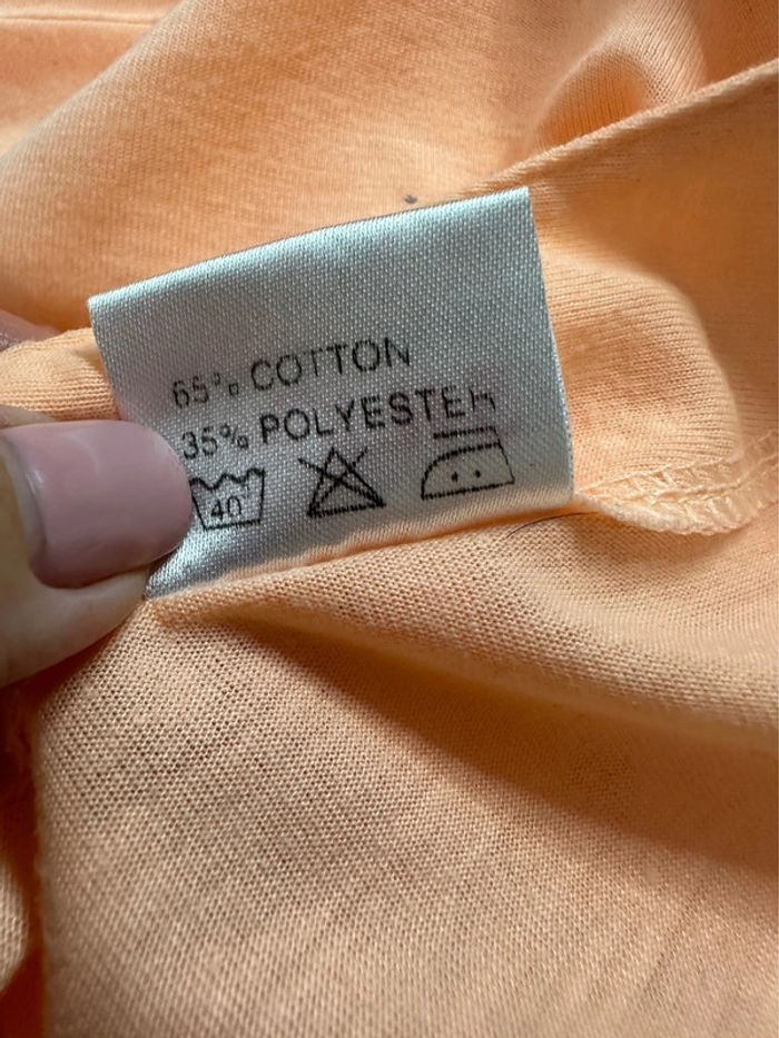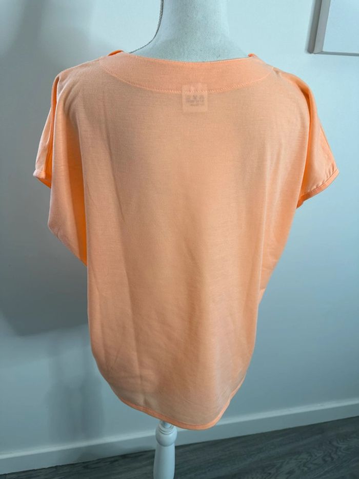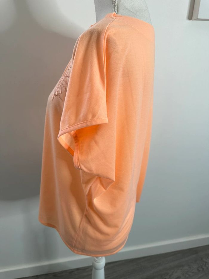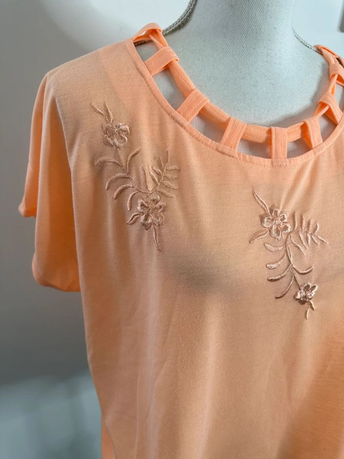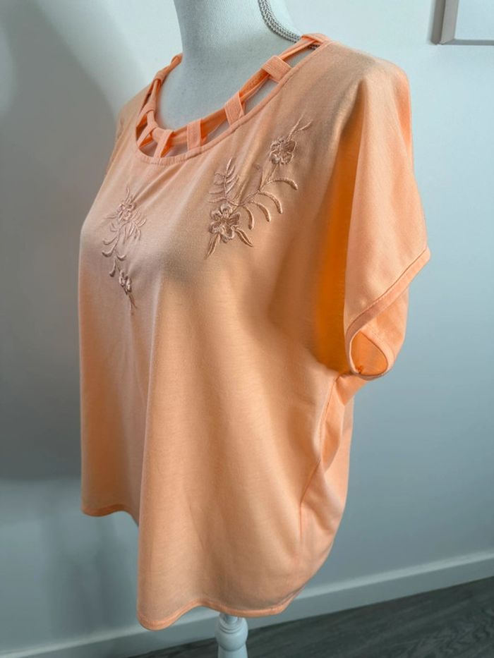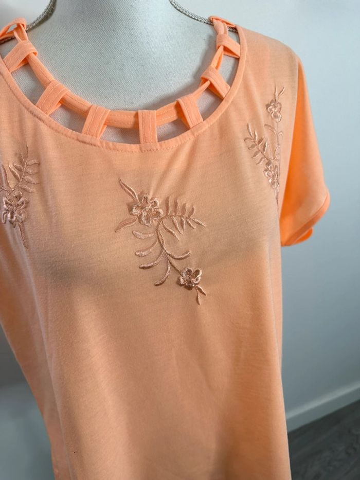T-shirt - Excellent état - Manches courtes - Taille 40 équivalent L - Broderies fleurs au niveau du col - Col ajouré - Vintage, années 80-90’ - Couleur orange abricot - Coton et polyester