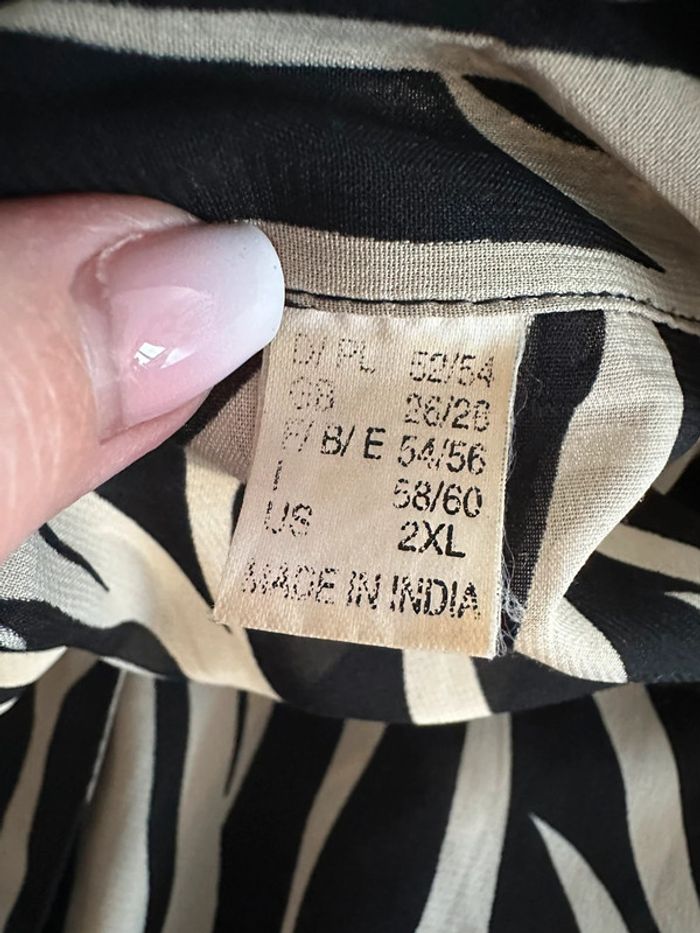 Robe chemise - Excellent état - Taille 54/56 équivalent 7XL/8XL - Noir et beige crème - Imprimés zèbre - Manches longues - Tissus fluide - Se ferme avec des boutons - À porter en robe ou en chemise en fonction de votre morphologie - Vintage, années 90’ - Fabriquée en Inde - Quelques fils tirés très discrets (voir photos) Dimensions: -73cm niveau aisselle -95cm de long