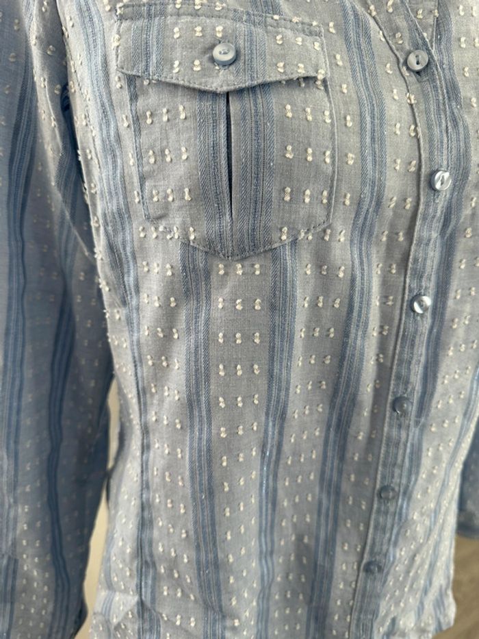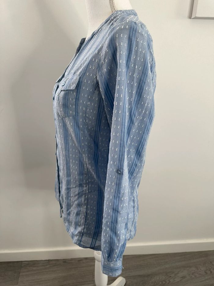 Chemisier plumetis - Excellent état - Taille 40 équivalent L - Bleu ciel et blanc - Légèrement pailleté - Coton, polyester et fibre métallisée - Se ferme avec des boutons - Deux poches au niveau de la poitrine - Manches longues