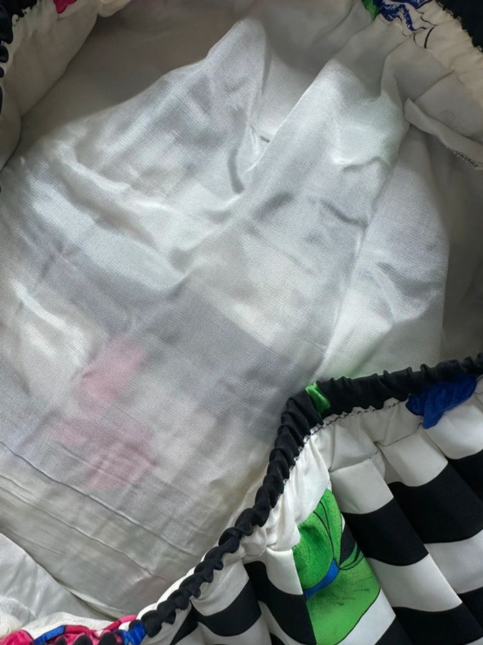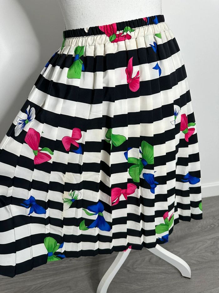 Jupe plissée marinière - Excellent état - Taille 38/40 équivalent M/L - Noire blanche et multicolore - Doublure intérieure - Imprimés flots, noeuds - Élastique à la taille - Schneberger Vintage, années 80-90’ - Plus d’étiquette de taille ni de matière Dimensions: - 32 à 48cm à la taille - 60cm de long