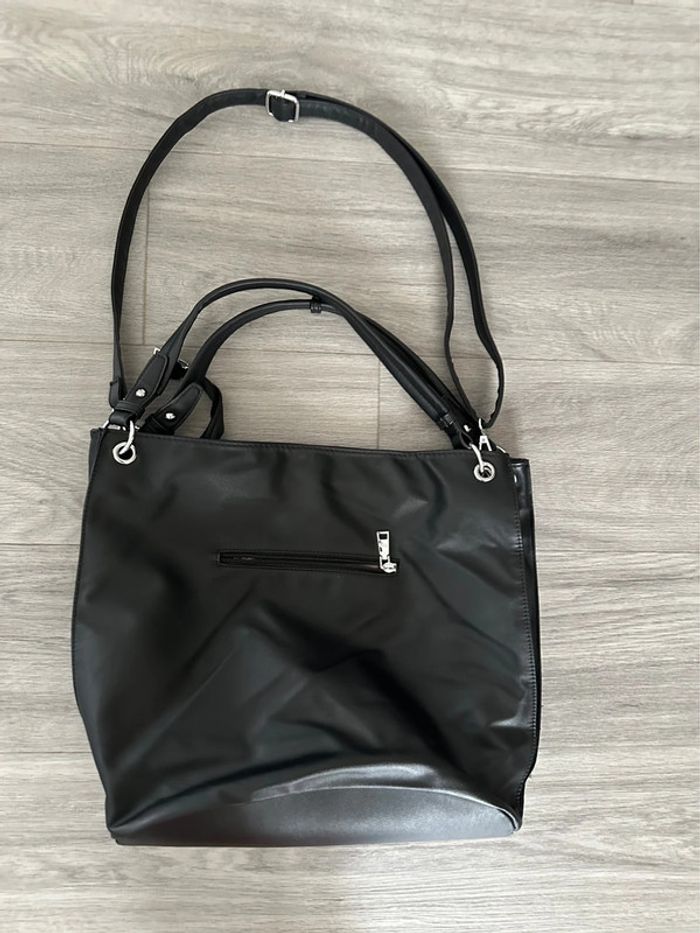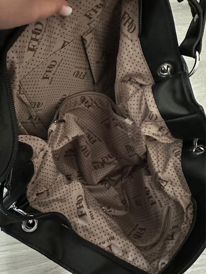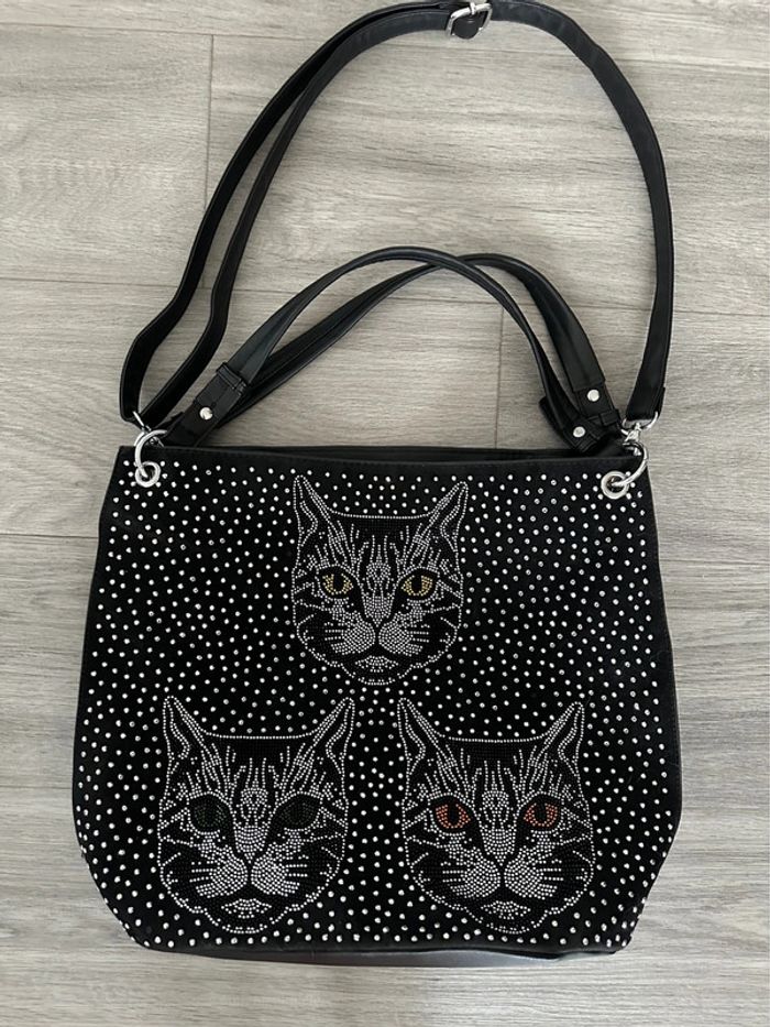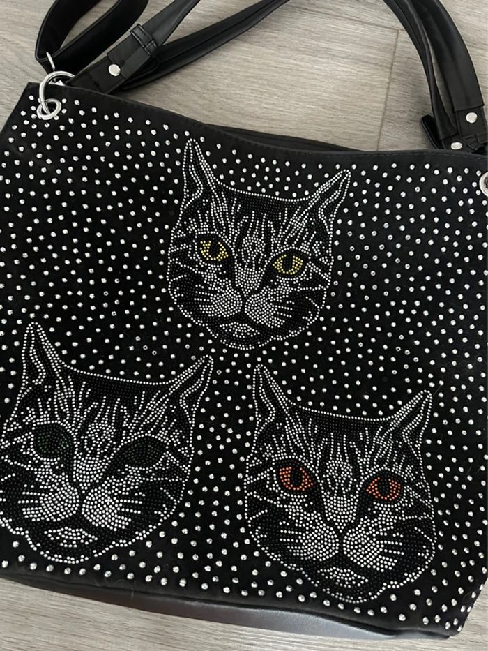 Grand sac à main - Excellent état - Couleur noir - Strass argentés - Motifs chat - Style kitsch, kitch - À porter à la main avec deux anses ou en bandoulière - Bandoulière réglable et amovible - Nombreux compartiments intérieurs - Petite poche à l’arrière - Se ferme avec un zip - Doublure intérieure en tissus Dimensions: - 34,5cm de haut - 43cm de large - 15cm de profondeur - 49cm petite anses