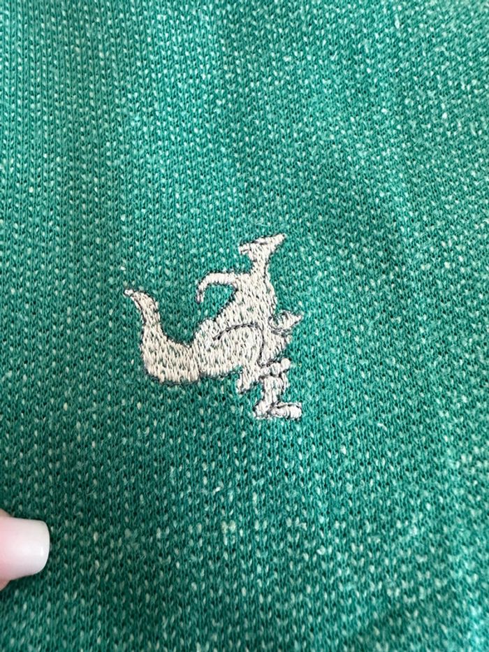 Polo oversize - Excellent état - Taille 46/48 équivalent 3XL/5XL - Vert moucheté et blanc - Broderie kangourou blanche - Se ferme avec des boutons au niveau du col - Fabrication italienne 🇮🇹 - Coton et acrylique - Modèle unisexe - Vintage, années 80’ - Pas d’étiquette de taille
