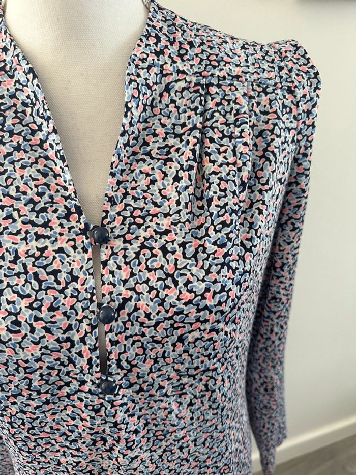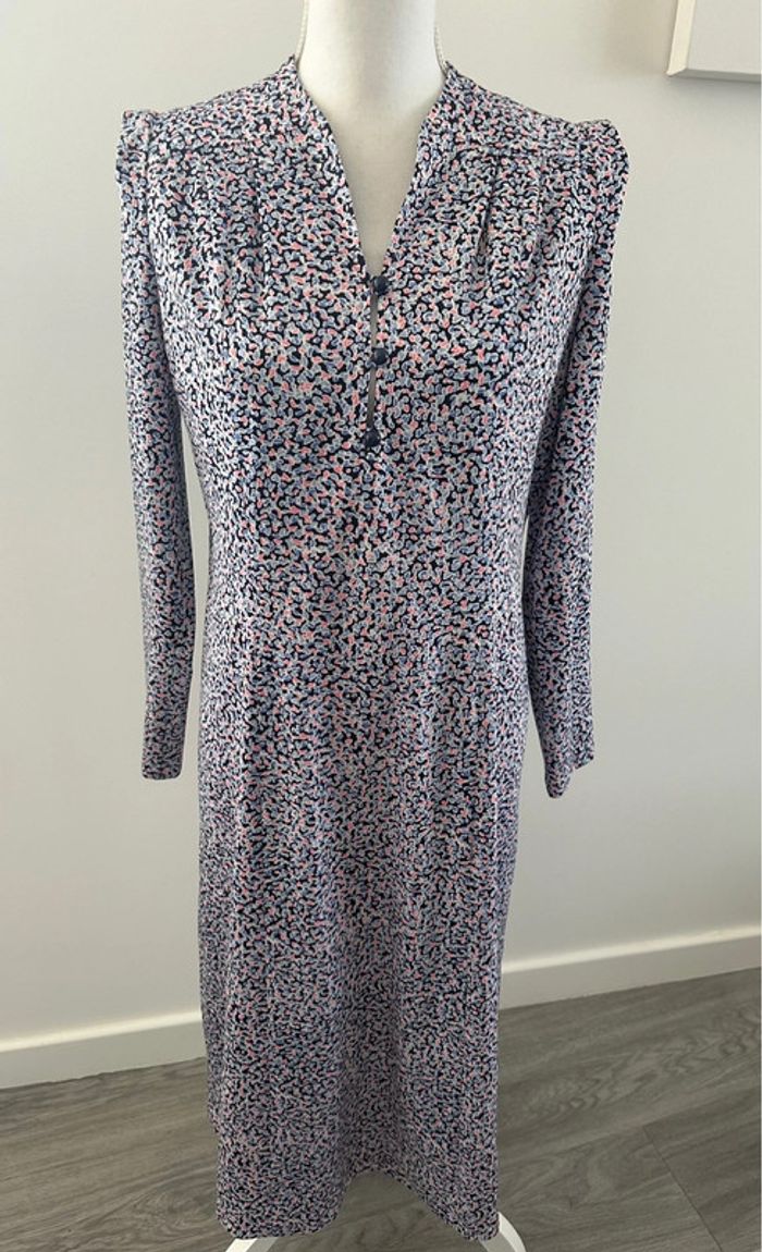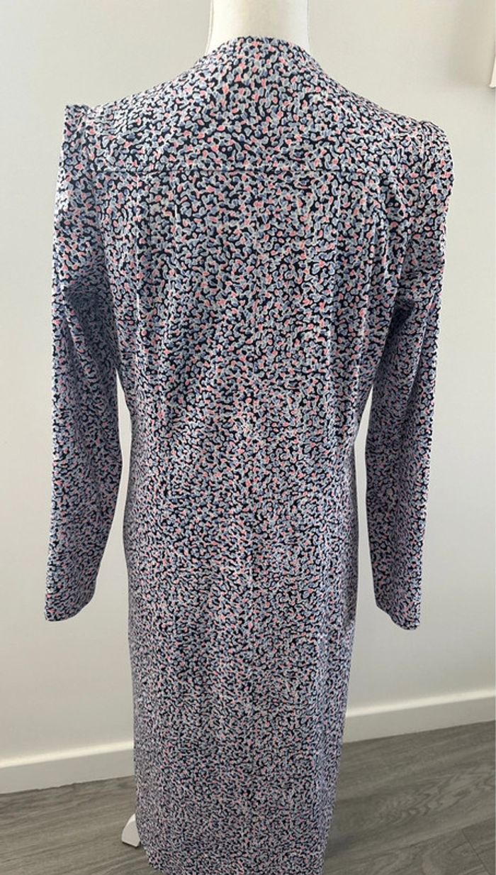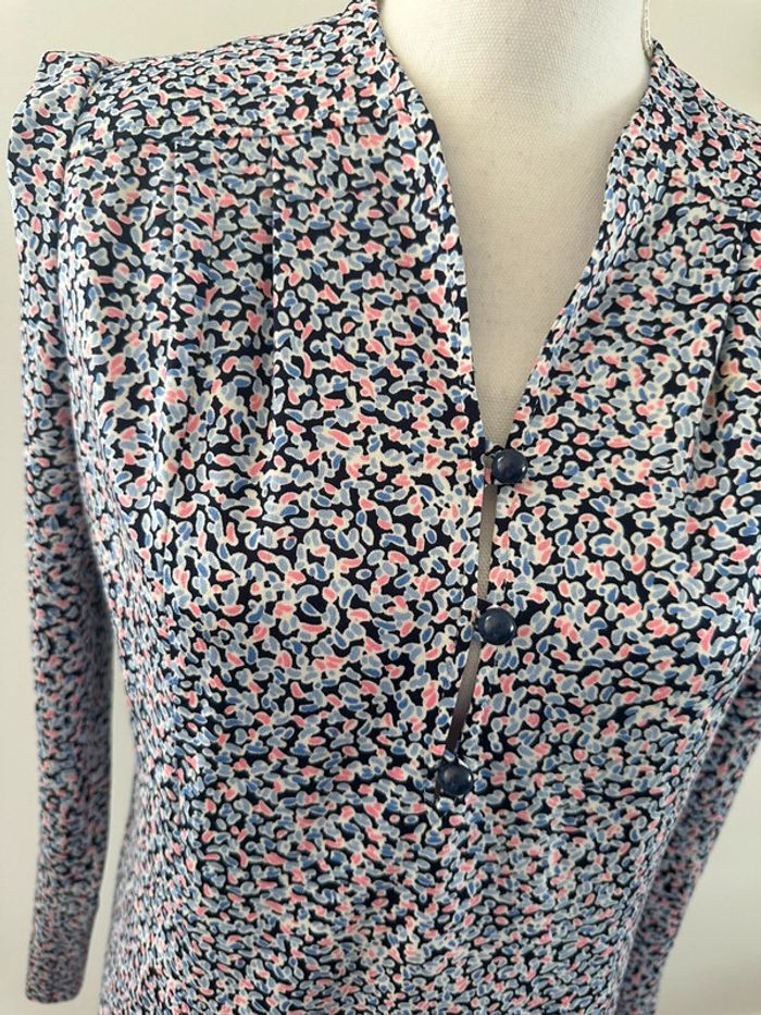 Robe longue - Excellent état - Taille 40/42 équivalent L/XL - Manches longues - Tissus bariolé - Bleu marine, bleu clair, blanc et rose - Doublure intérieure - Boutons au niveau du décolleté - Vintage, années 80´ - Tissus fluide - Plus d’étiquette de taille ni de matière Dimensions: - 50cm niveau aisselle - 112cm de long