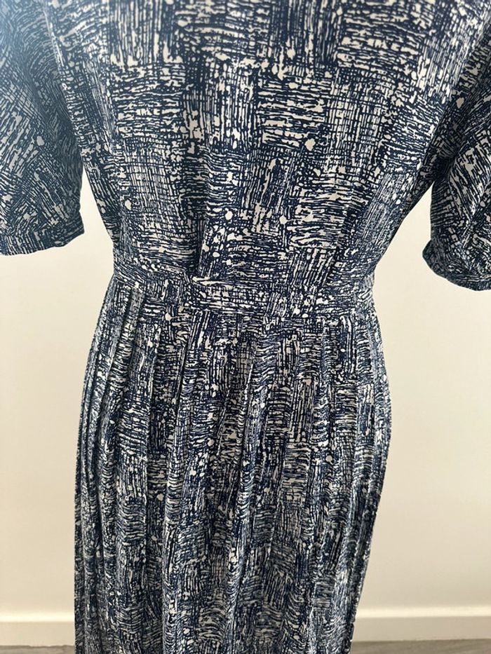 Robe mouchetée - Excellent état - Taille 40/42 équivalent L/XL - Bleue marine et blanche - Tissus imprimés mouchetés - Vintage, années 80’ - Se ferme avec des boutons sur le haut - Manches courtes - Jupe plissée - Tissus fluide - Plus d’étiquette de taille ni de matière Dimensions: - 52cm niveau aisselles - 105cm de long