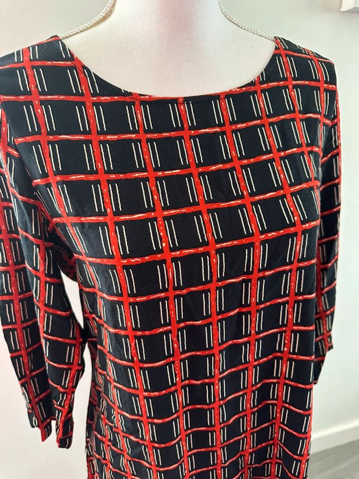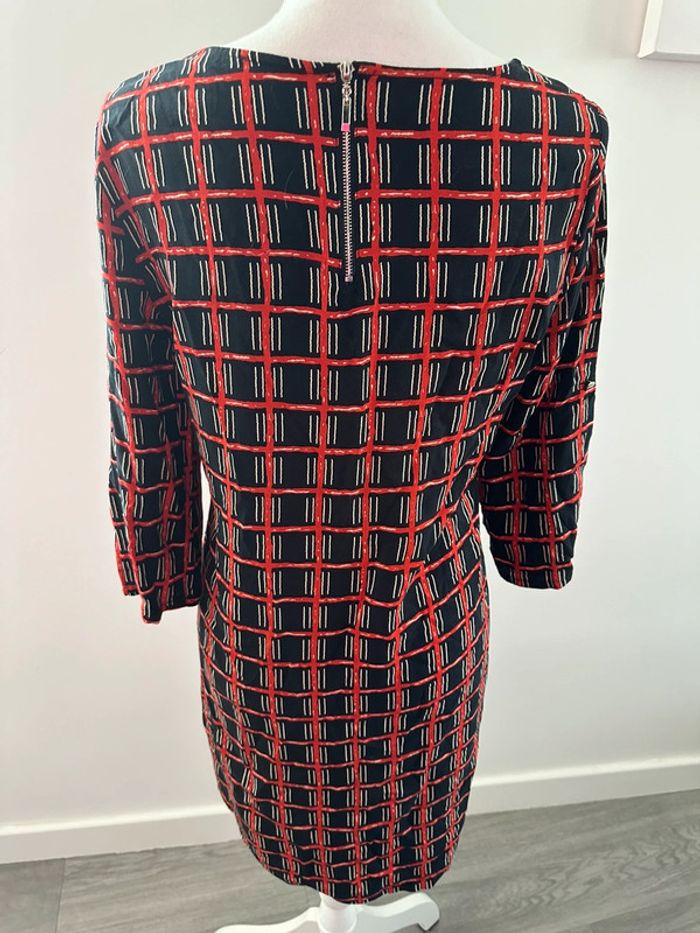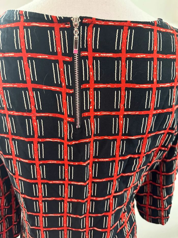 Robe à carreaux - Excellent état - Taille 38 équivalent M - Noire et rouge - Col rond - Zip dans le dos - Manches 3/4 - Imprimés carreaux - Noire, blanche et rouge - 100% Viscose