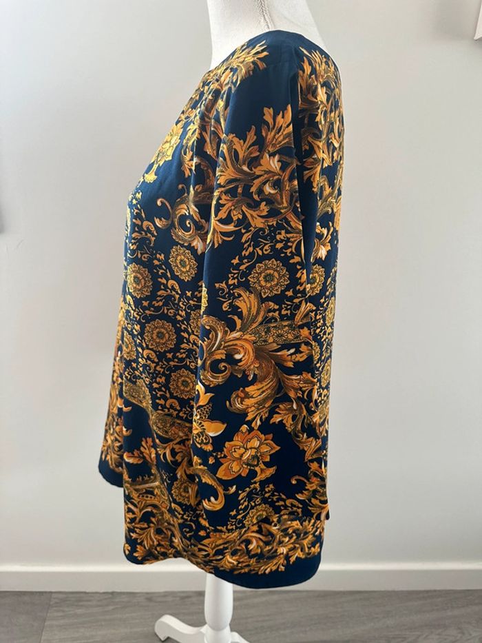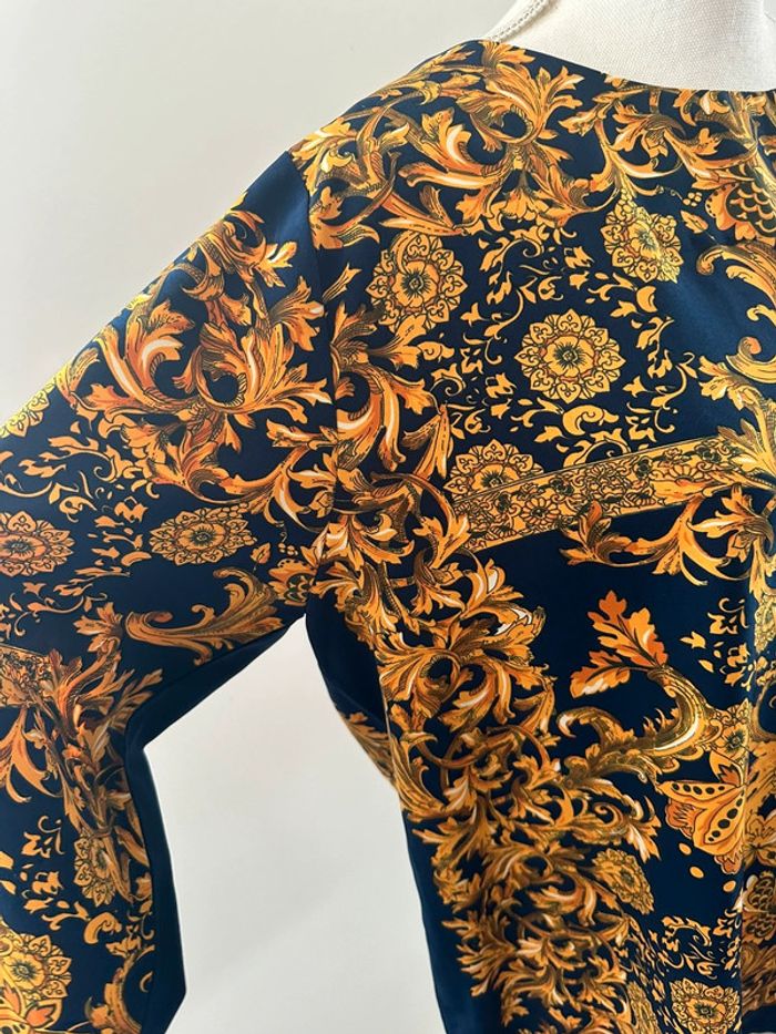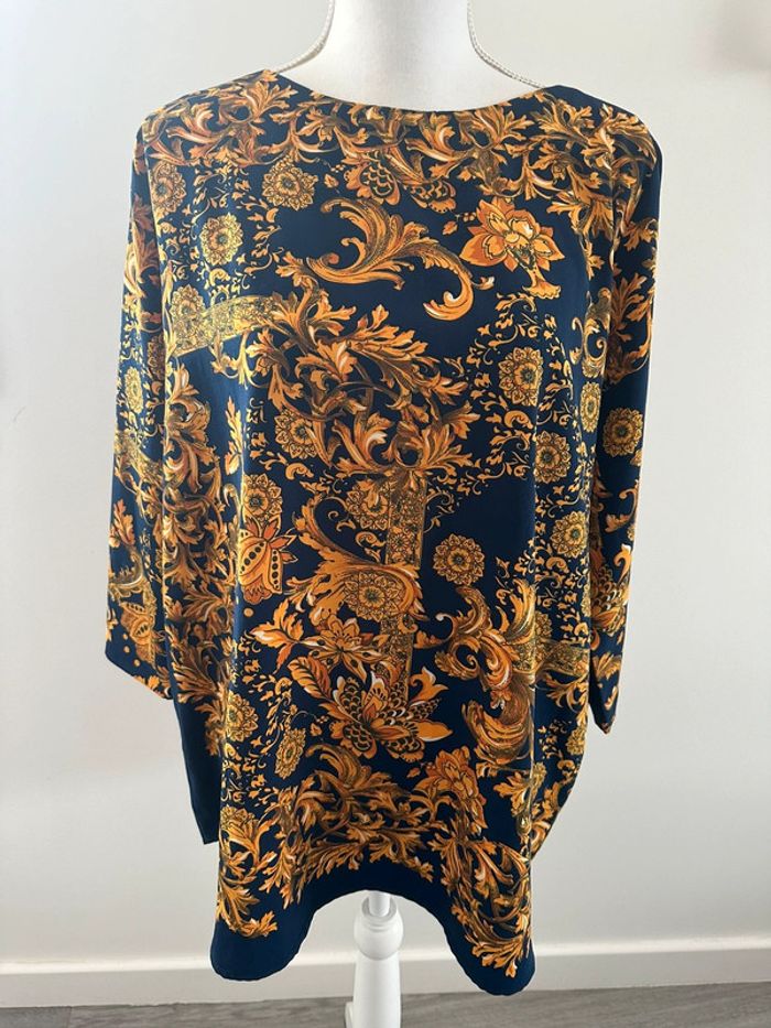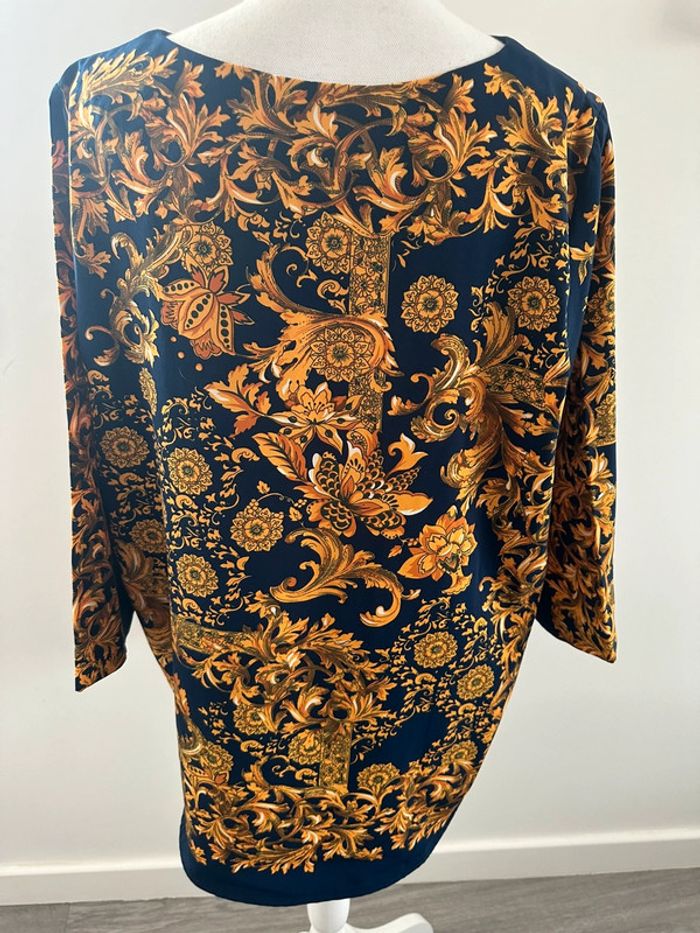 Blouse oversize - Excellent état - Taille 40/42 équivalent L/XL - Bleue marine et dorée - Imprimés baroques - Tissus fluide - Manches 3/4 - Plus d’étiquette de taille ni de matière Dimensions: - 60cm niveau aisselle - 73cm de long