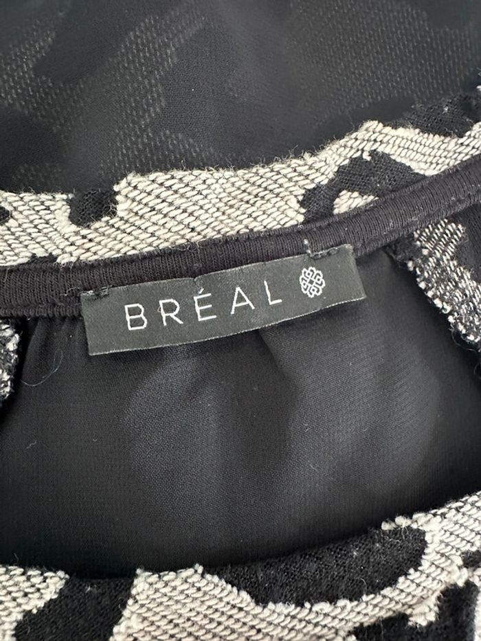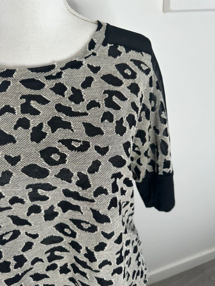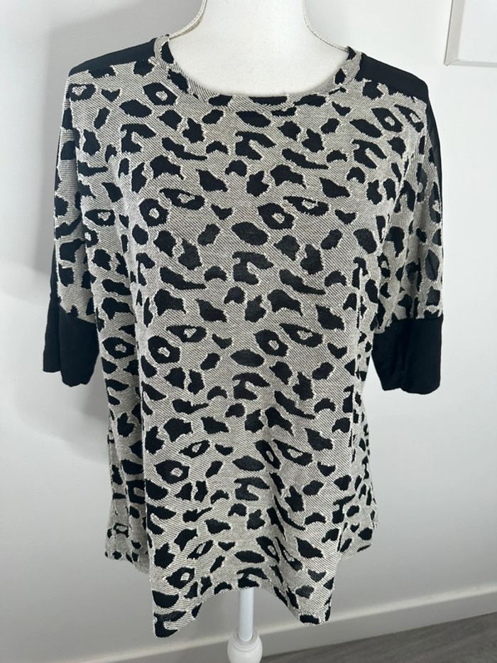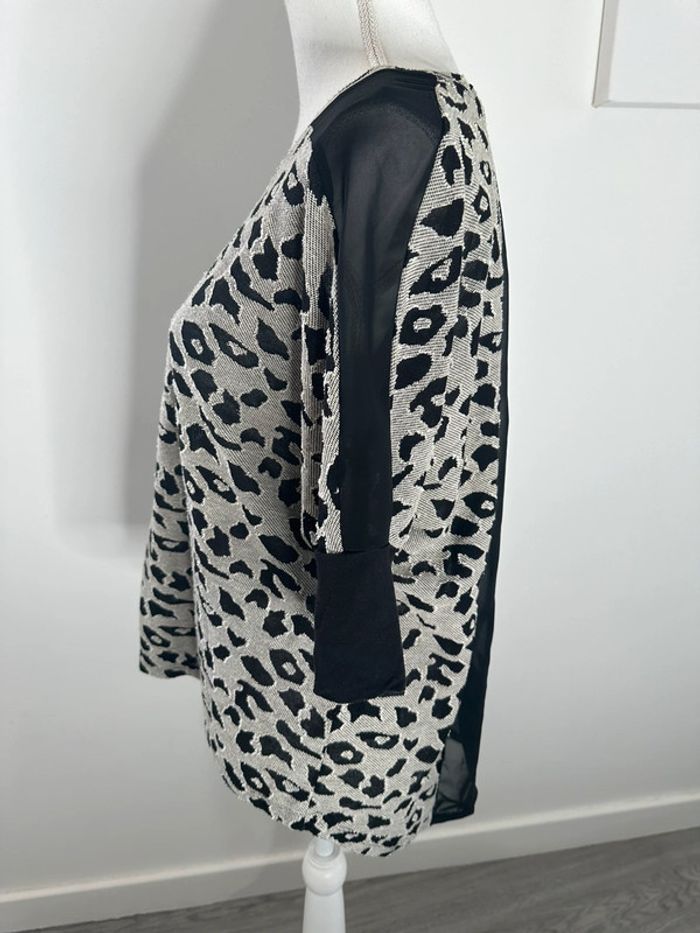 Blouse léopard - Excellent état - Taille 4 équivalent 44 2XL - Noire et grise - Marque Bréal - Manches courtes - Transparente dans le dos et au niveau des manches - Imprimés léopard - Polyester et coton