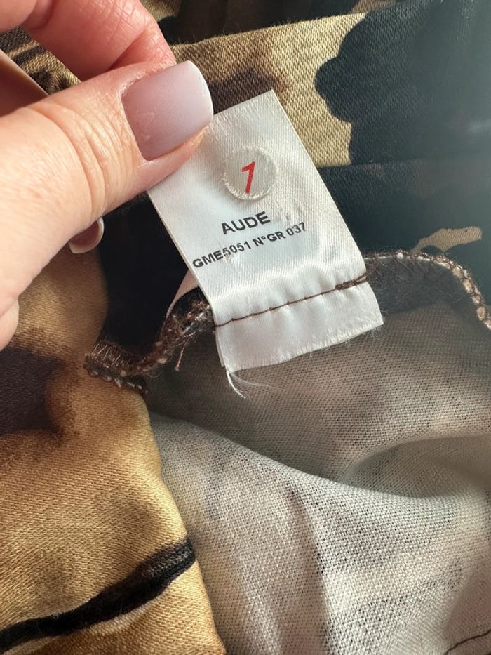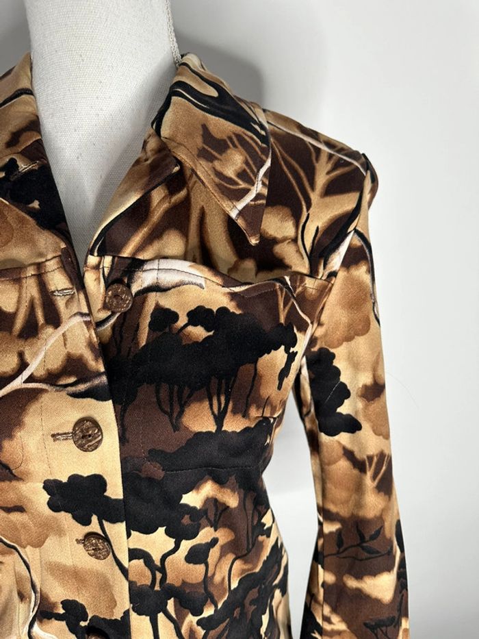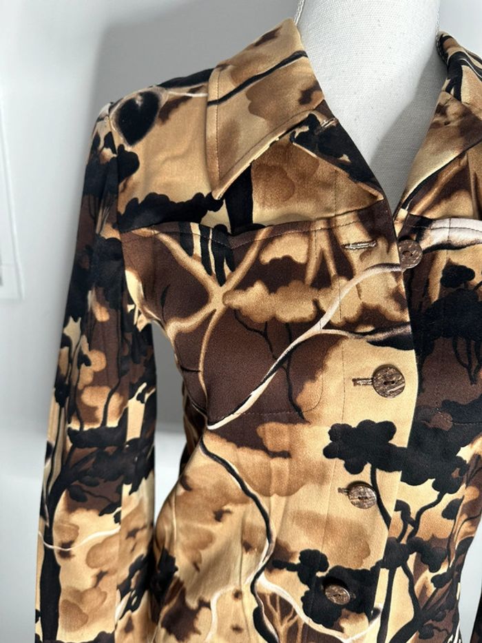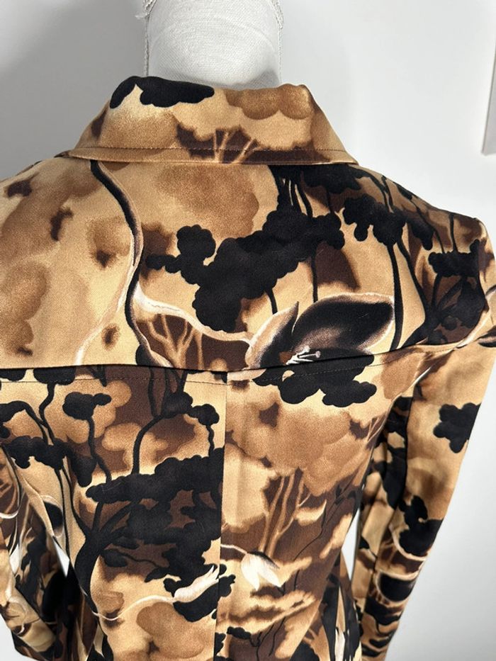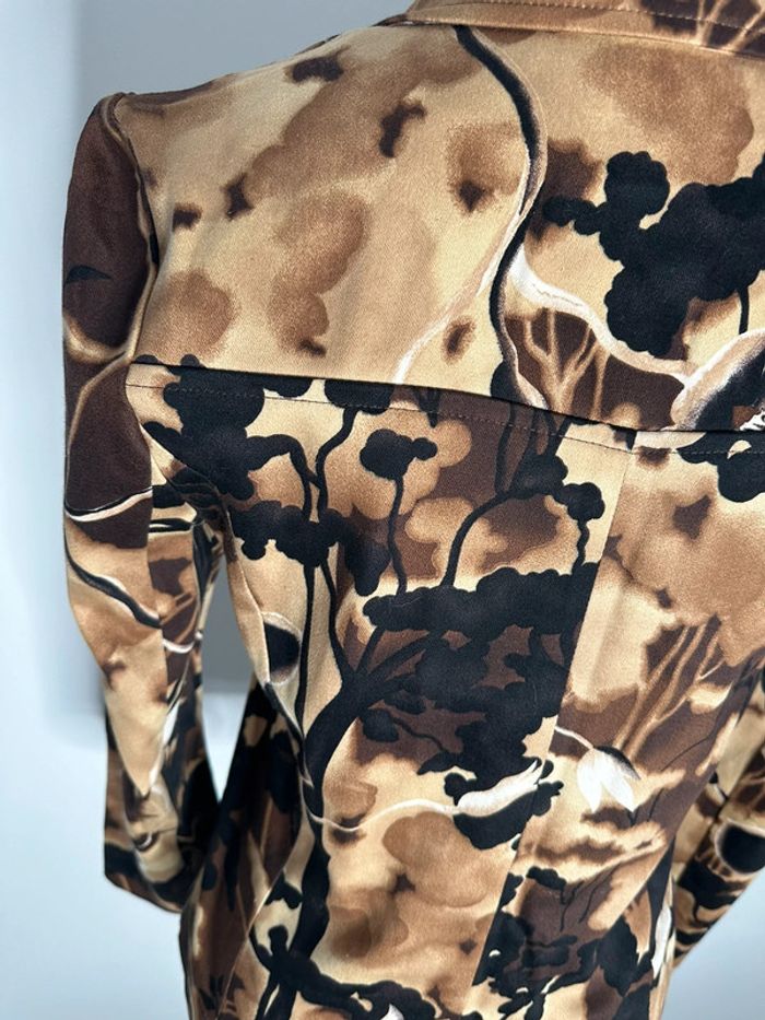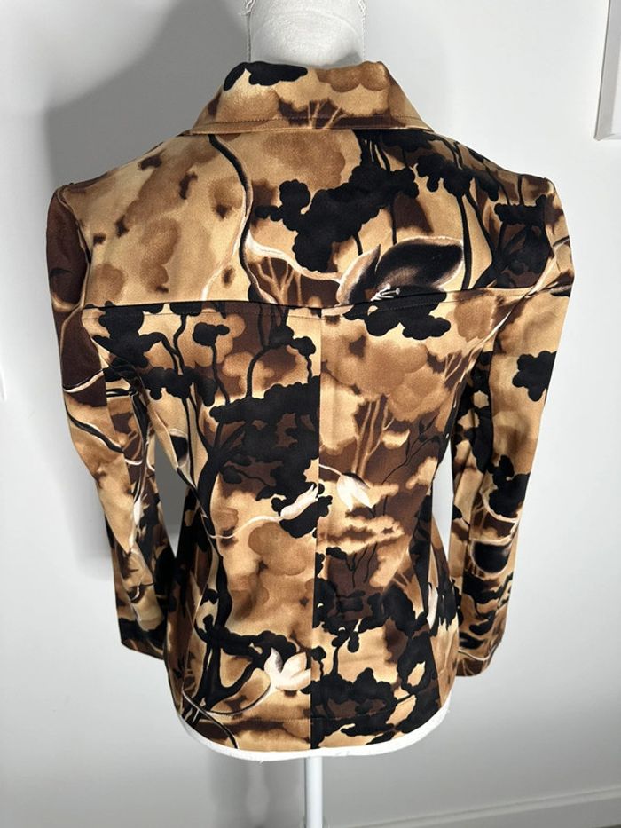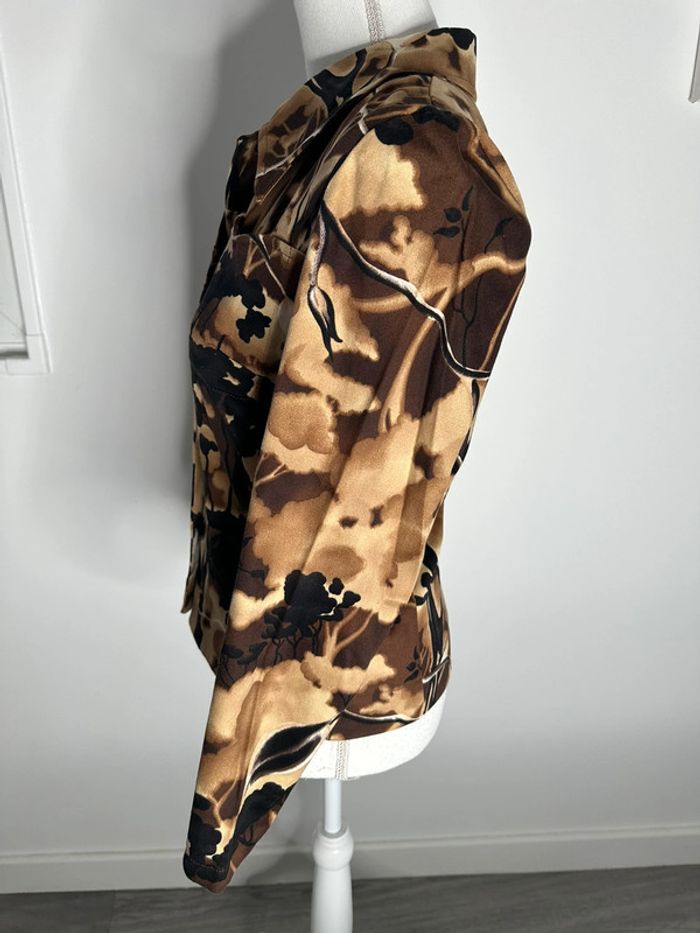 Veste en jean denim - Excellent état - Taille 36 équivalent S - Christine Laure - Se ferme avec des boutons - Poches au niveau de la poitrine - Imprimés fleurs - Marron et beige - Coton et élastane - Modèle Aude