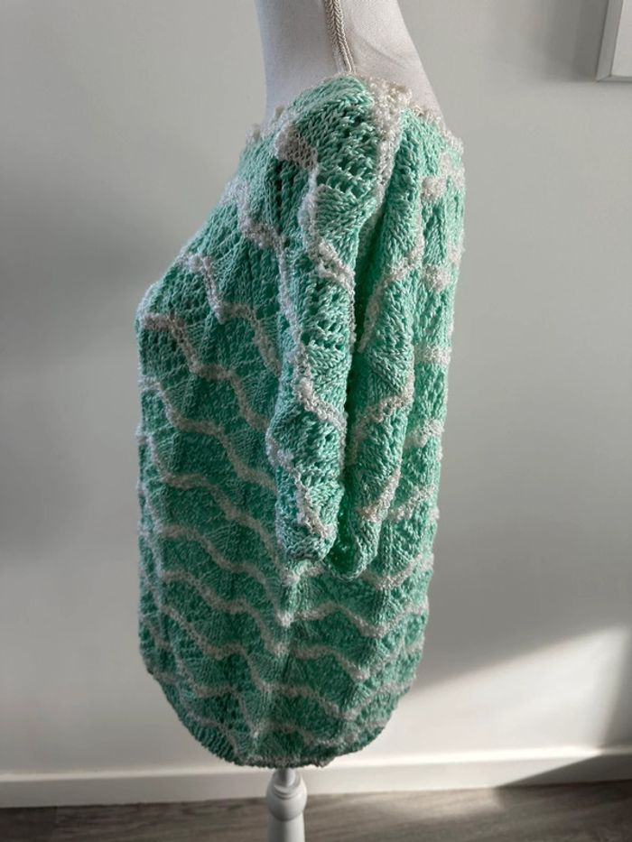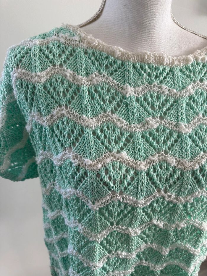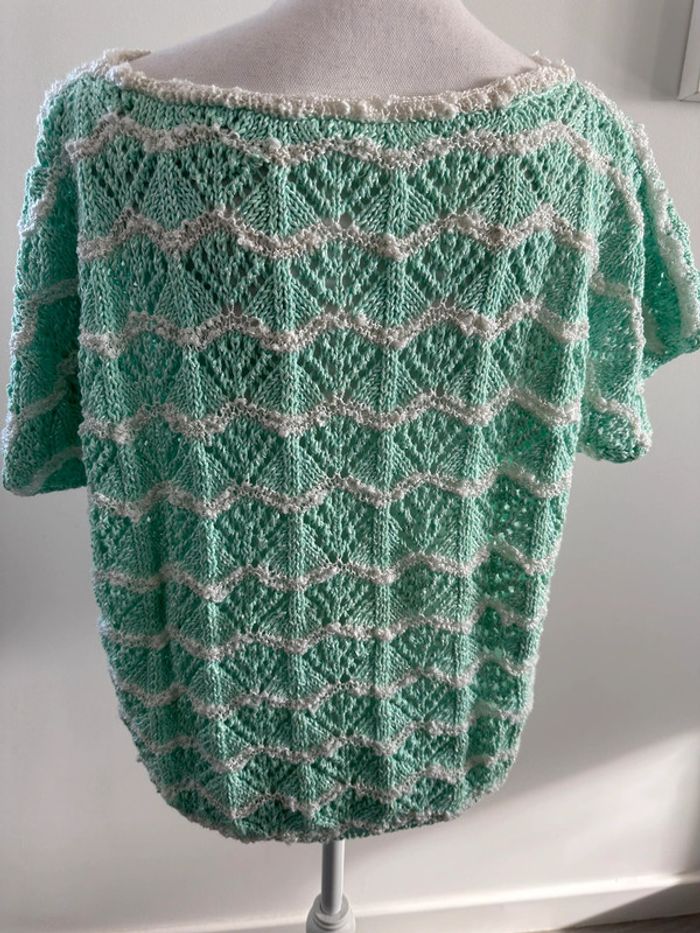 Blouse en crochet - Excellent état - Vert menthe et blanche - Taille 40 équivalent L - Manches courtes - En crochet ajouré - Vintage, années 90’ - Col large - Plus d’étiquette de taille ni de matière - Couleurs identiques aux photos