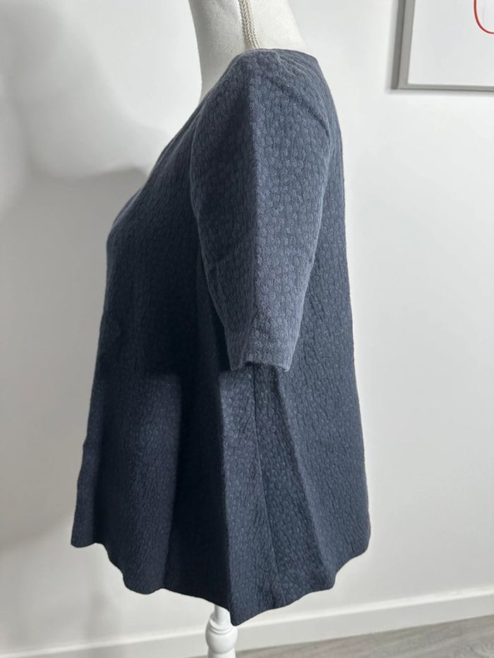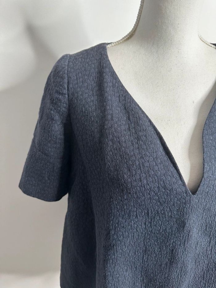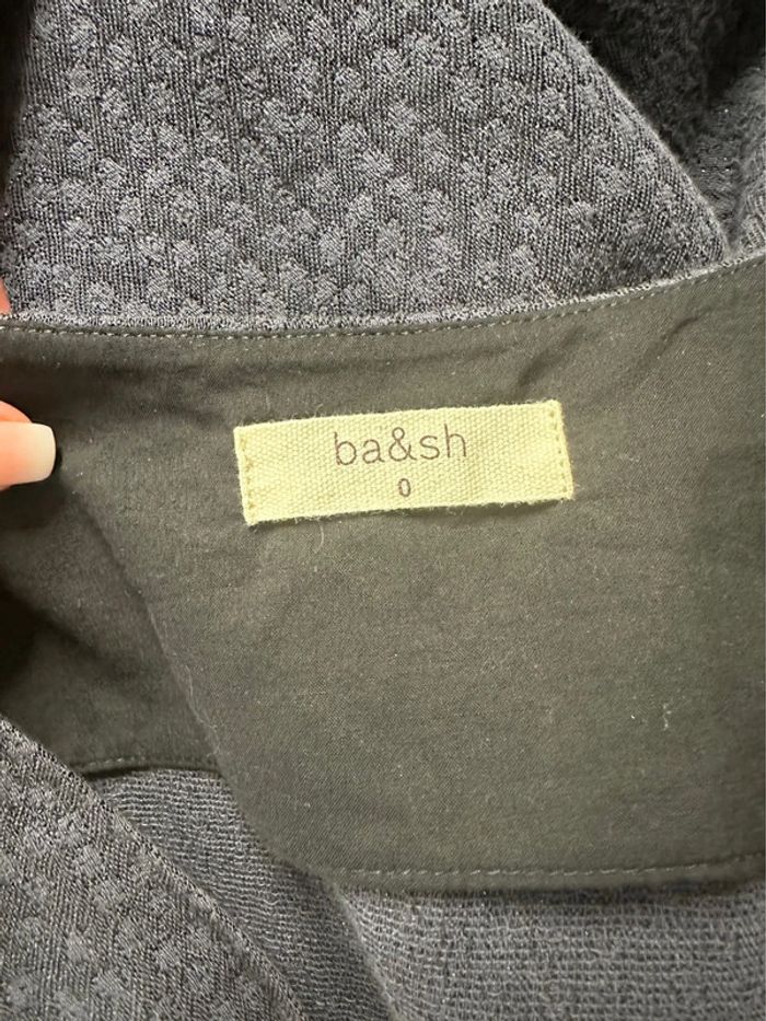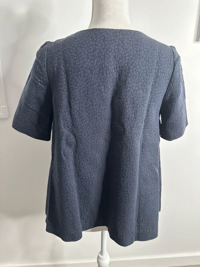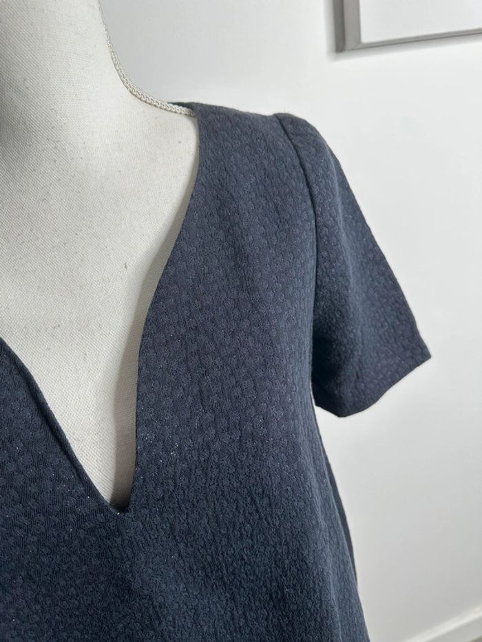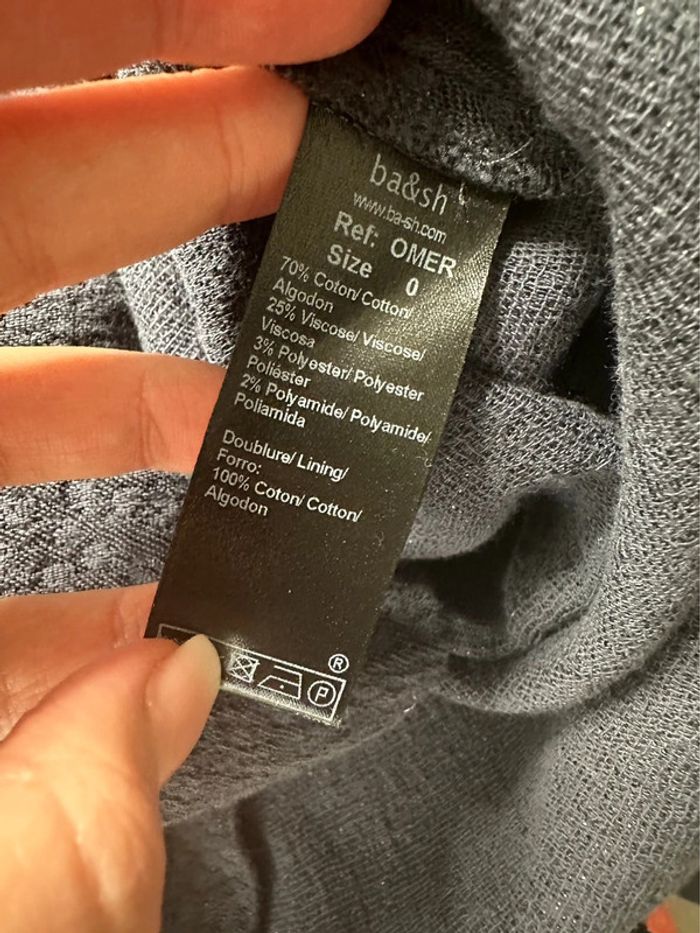 Blouse Péplum - Excellent état - Taille 0 équivalent 34 (ok 36/38 voir dimensions plus bas dans la description) - Bleue marine et argentée - Marque Ba&sh - Modèle Omer - Manches courtes - Tissus texturé - Doublure intérieure au niveau du col - Coton, viscose, polyester, polyamide Dimensions: - 51cm Aisselles - 58cm Longueur totale