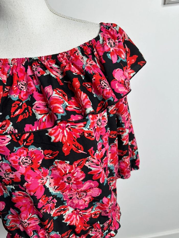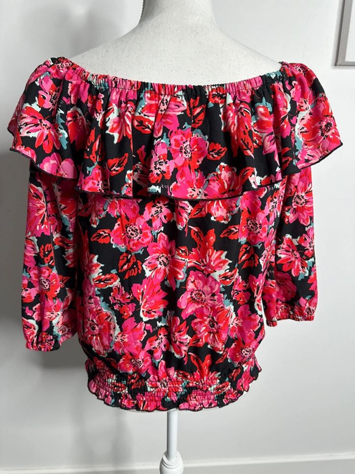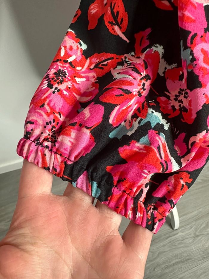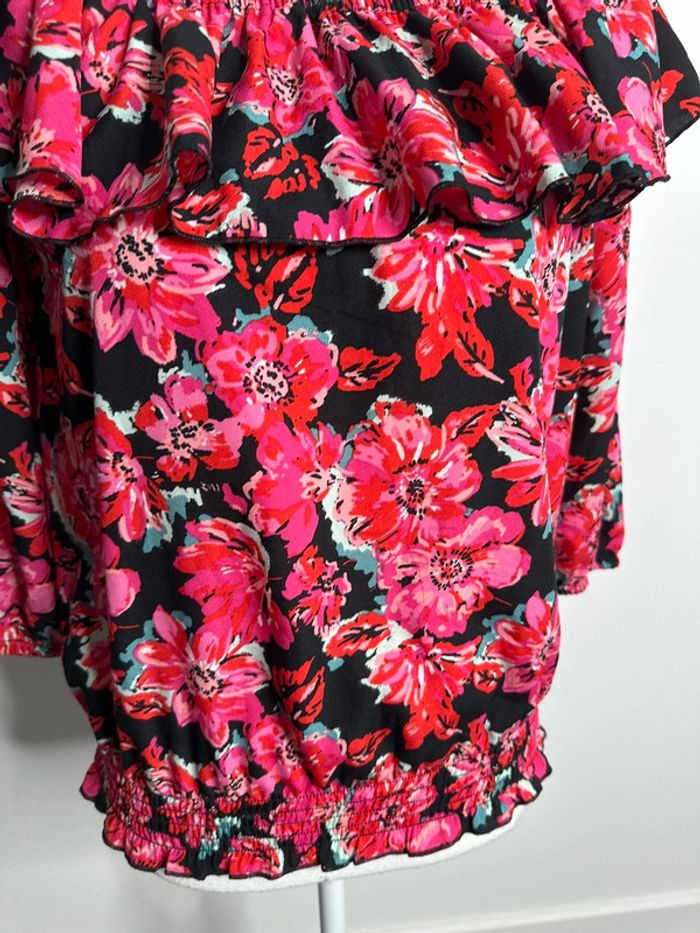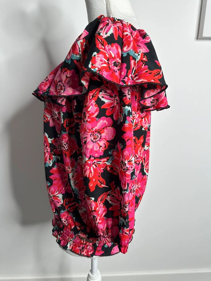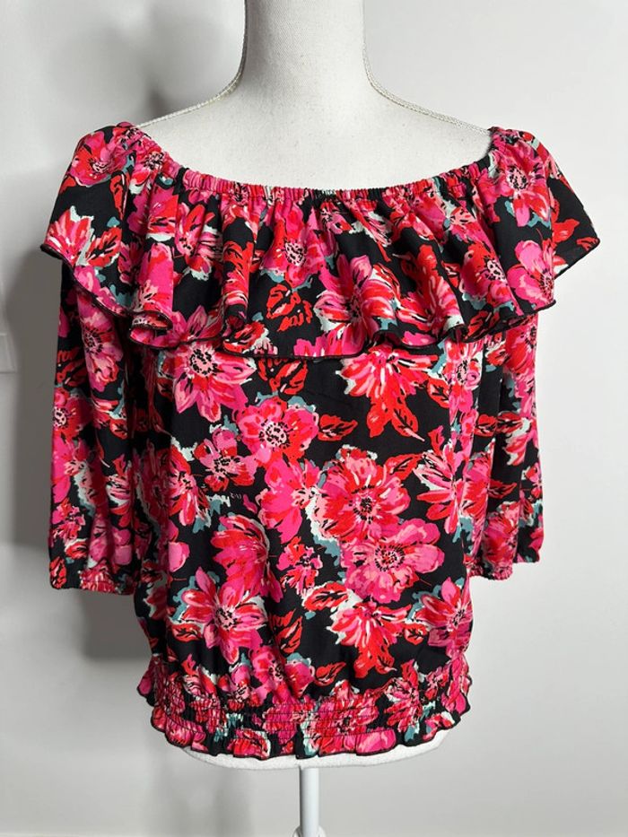Blouse à fleurs - Excellent état - Manches 3/4 - Taille 36 équivalent S - Mosquitos - Volant large au niveau du Col - Élastique à la taille et aux manches - Imprimés fleurs - Noire, rose et multicolore - 100% polyester - À porter sur les épaules ou sur les côtés
