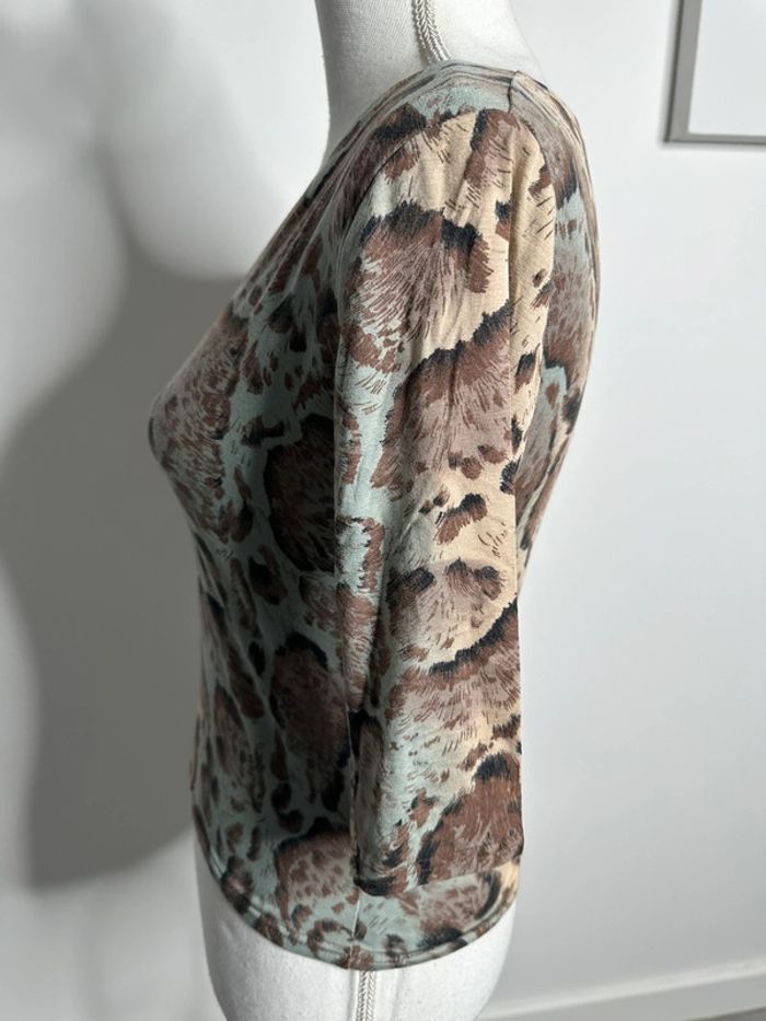 Blouse - Excellent état - Taille 36 équivalent S - Pecca Vintage - Style 2YK - Manches 3/4 - Col en V - Matière stretch - Imprimés léopard girafe - Beige marron et bleue - Années 90’-2000´