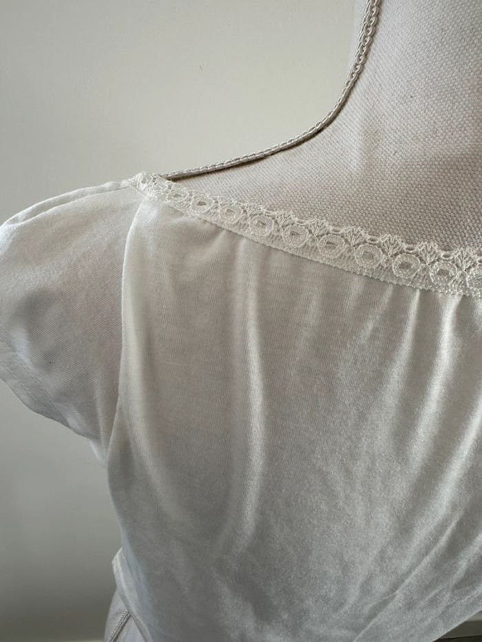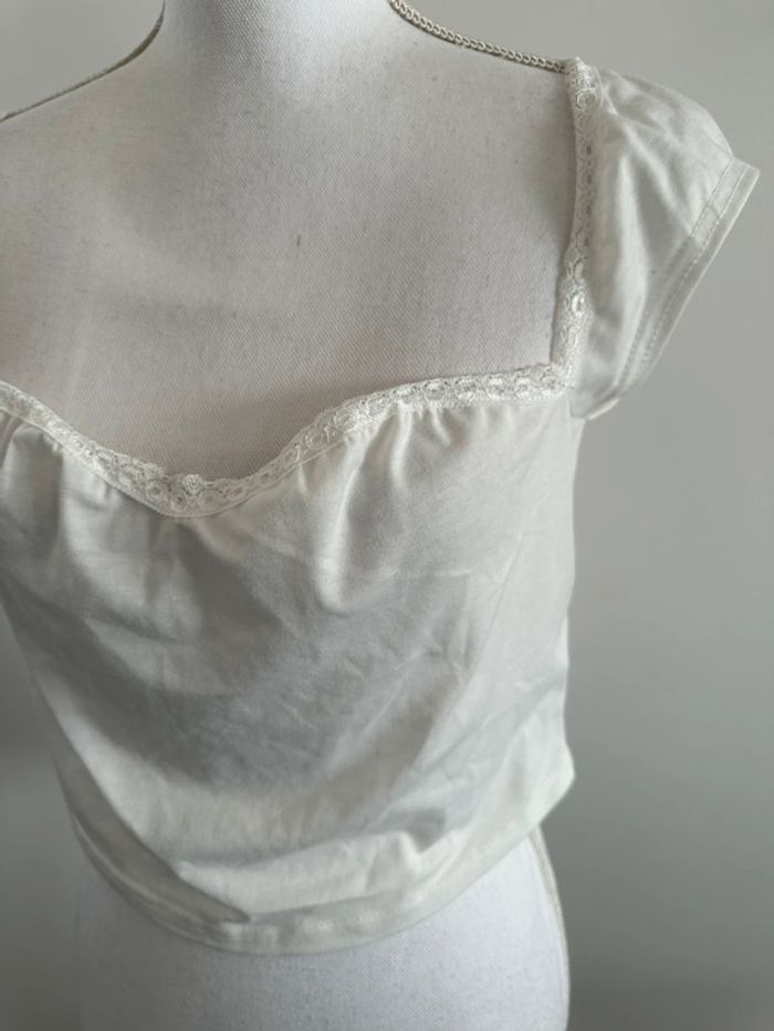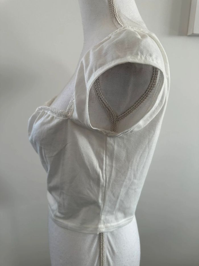 Crop top - Excellent état - Taille 38 équivalent M - Details en dentelle - Couleur blanche - Manches courtes - Plus d’étiquette de taille ni de matière