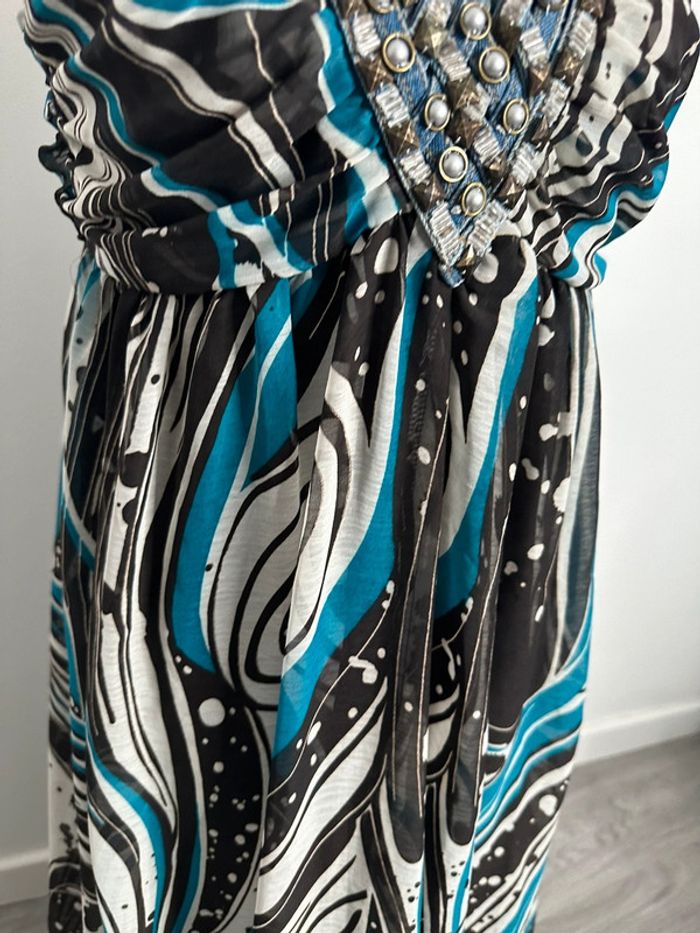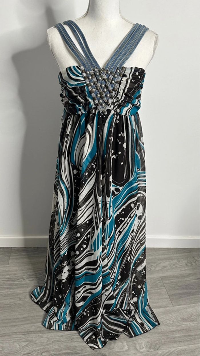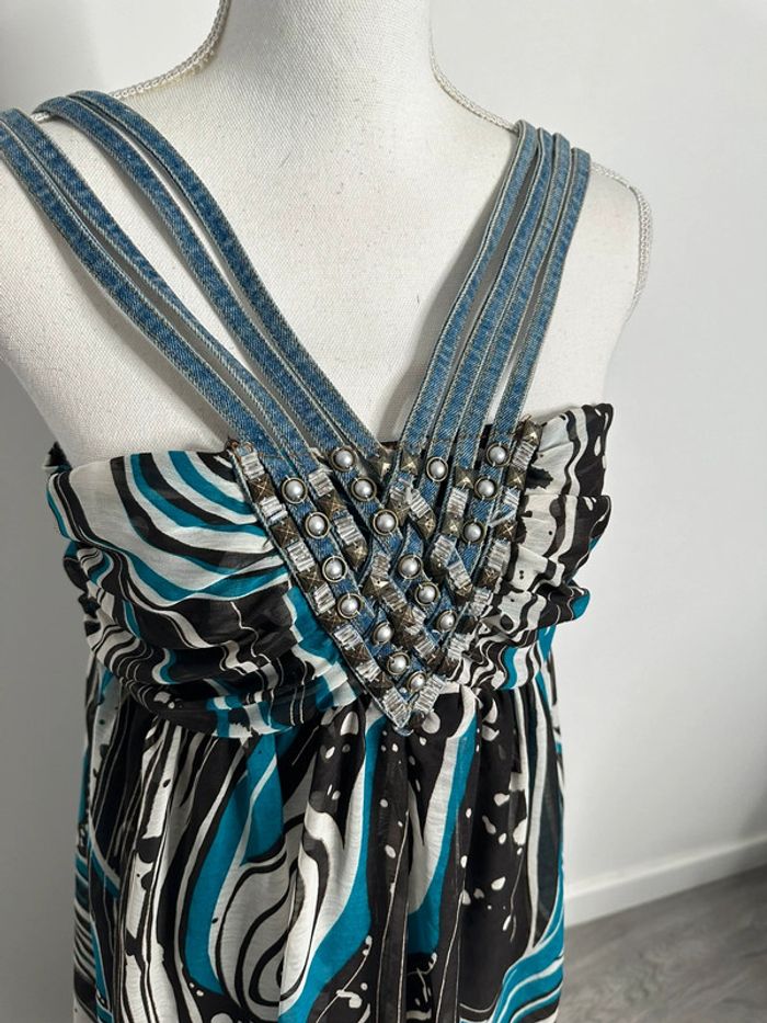 Robe longue - Excellent état - Taille 38 équivalent M - Bleue, blanche et noire - Style 2YK - Bretelles en jeans denim - Doublure intérieure - Perles brodées au niveau du décolleté - Élastiques au niveau du dos - Plus d’étiquette de matière