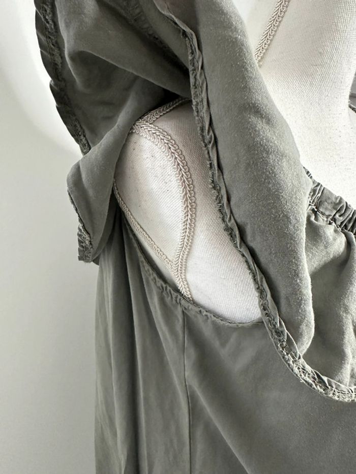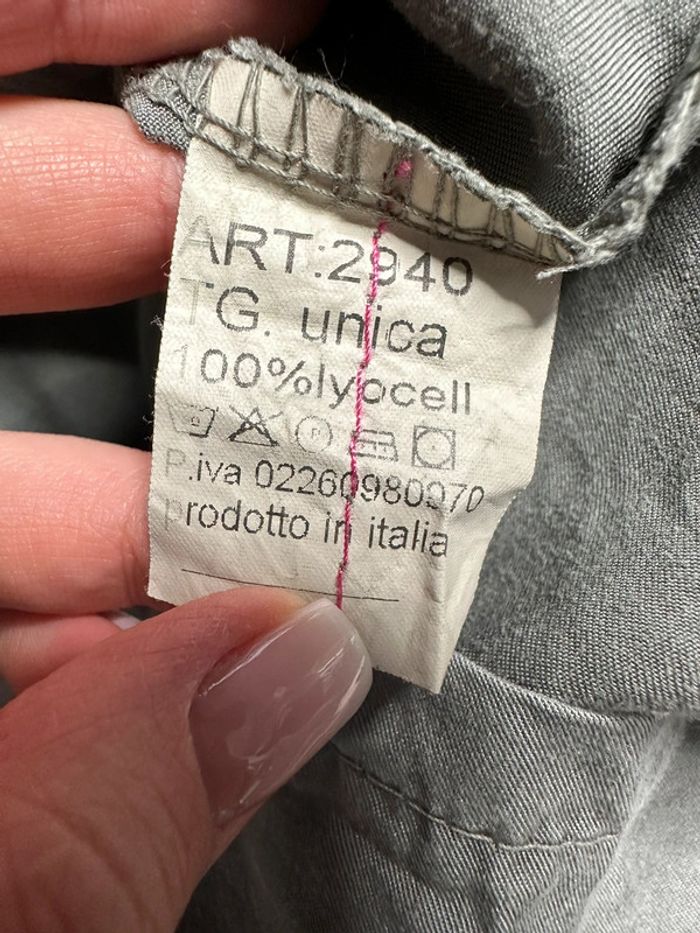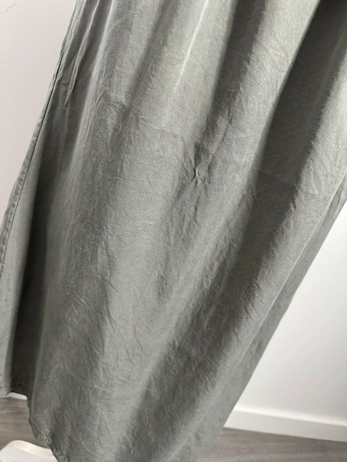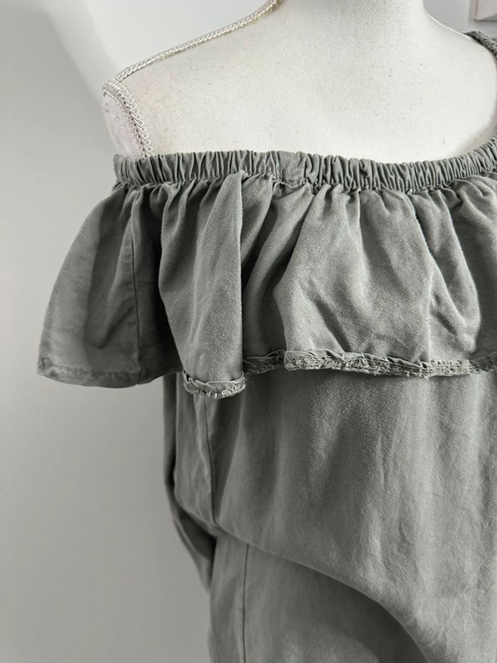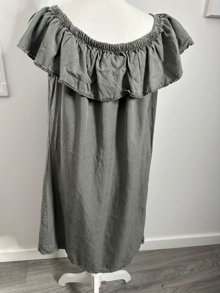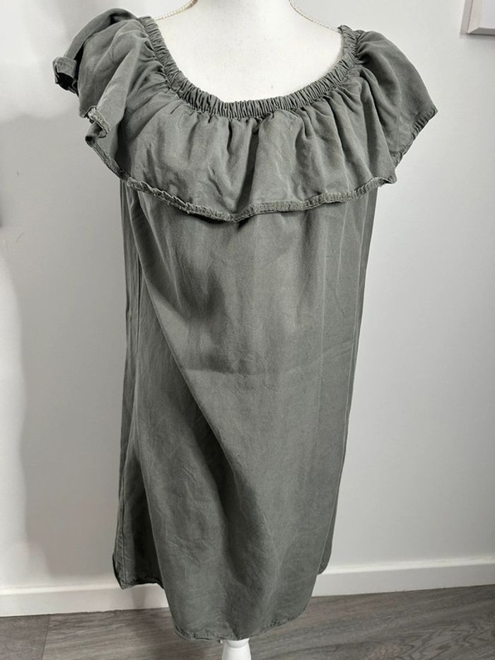 Robe en jean denim - Excellent état - Taille unique, équivalent M 38 - Couleur gris kaki - Élastique au niveau des épaules - Volant large au niveau du haut - Fabrication italienne 🇮🇹 - 100% Lyocell