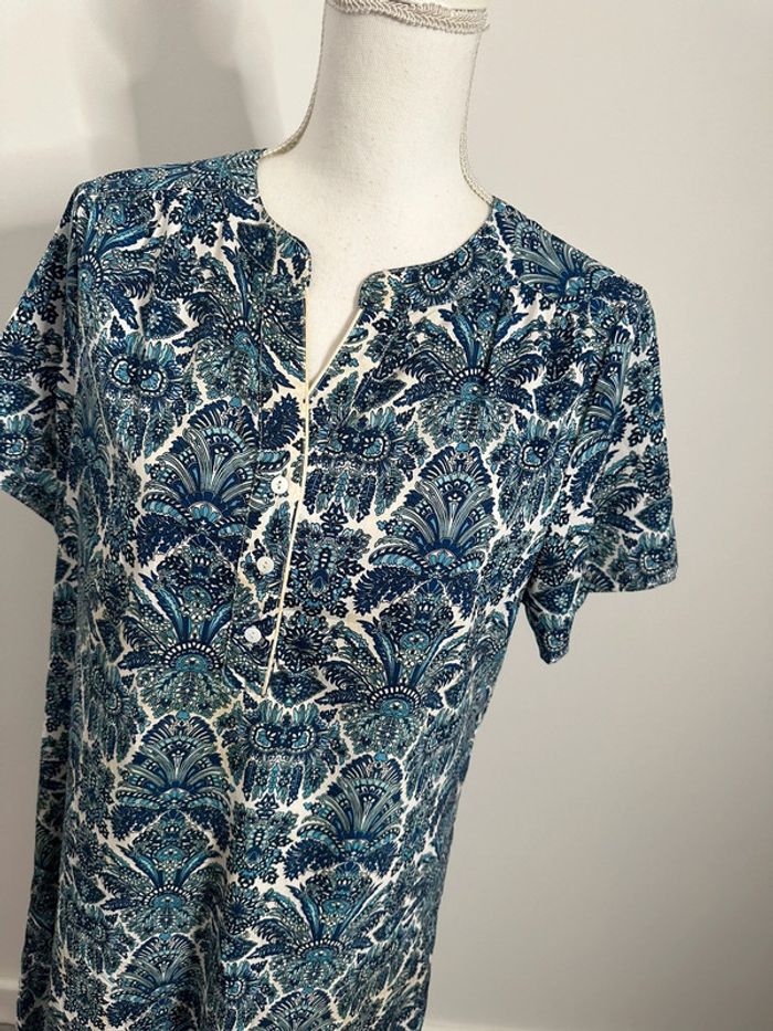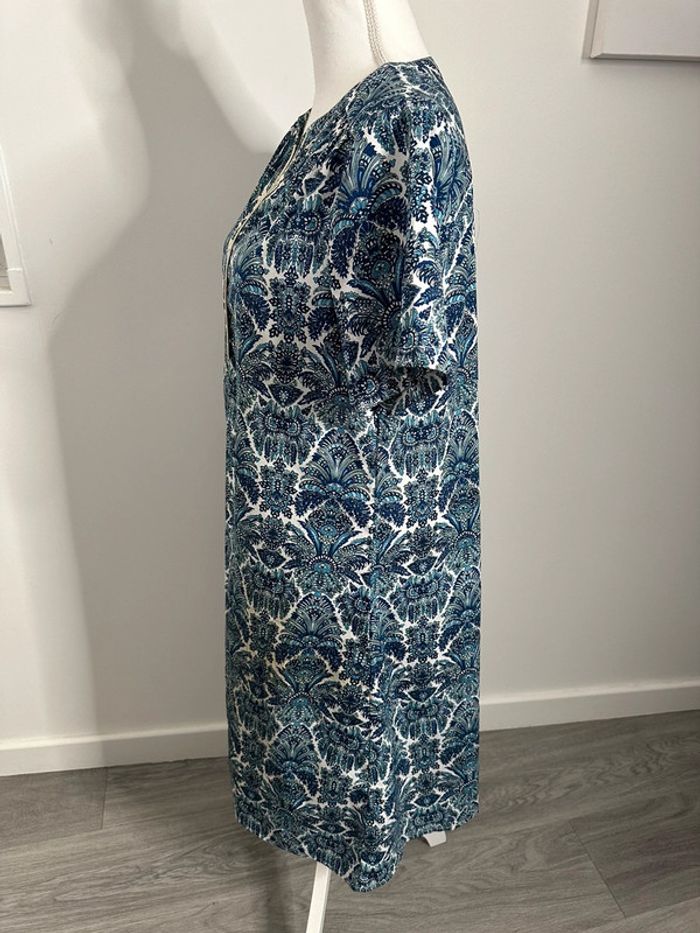 Robe à fleurs mandalas - Excellent état - Taille 42 équivalent XL - Blanche et bleue - Marque Damart - Imprimés fleurs et mandalas - Manches courtes - Boutons au niveau du col - 100% polyester