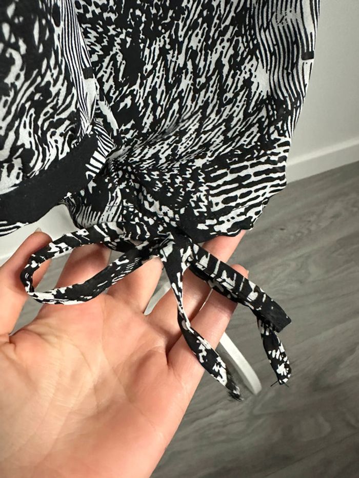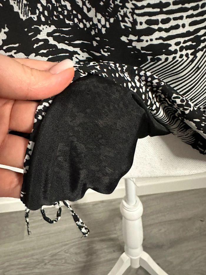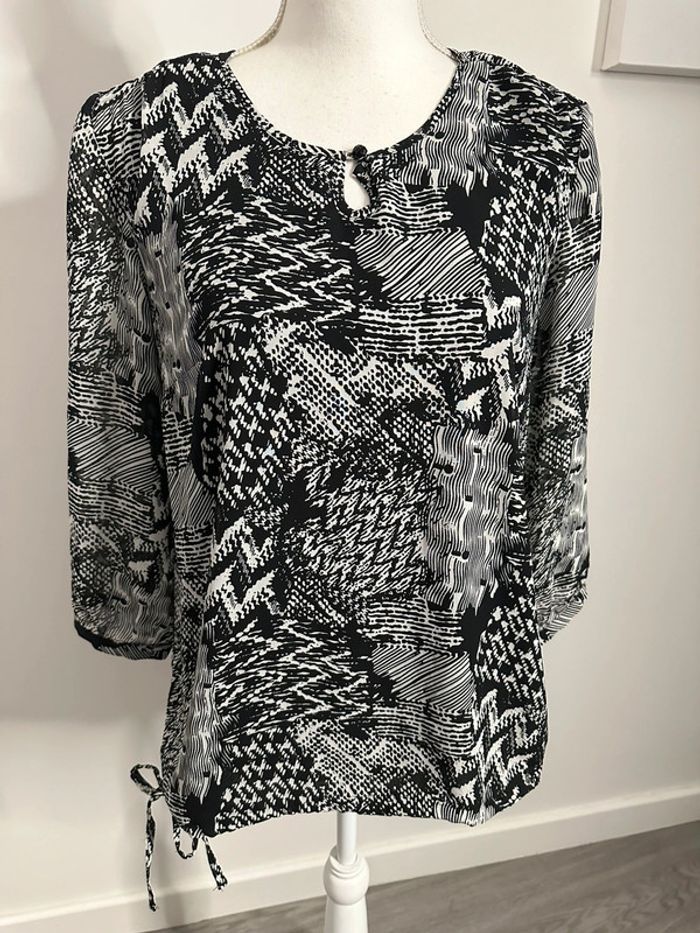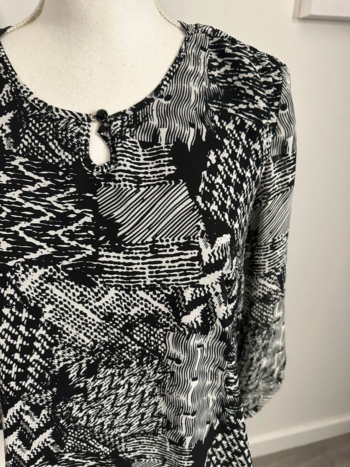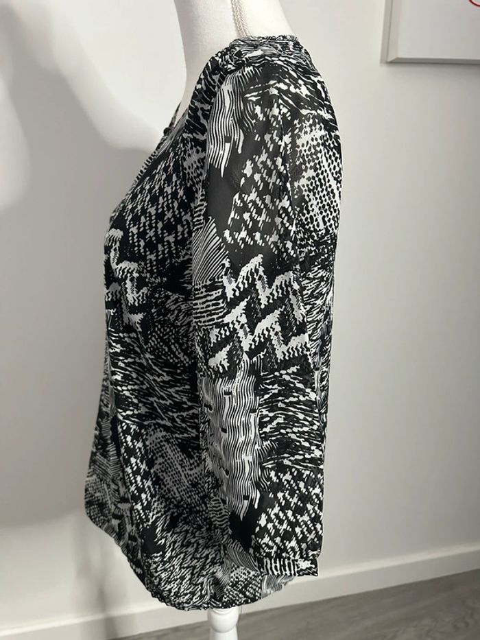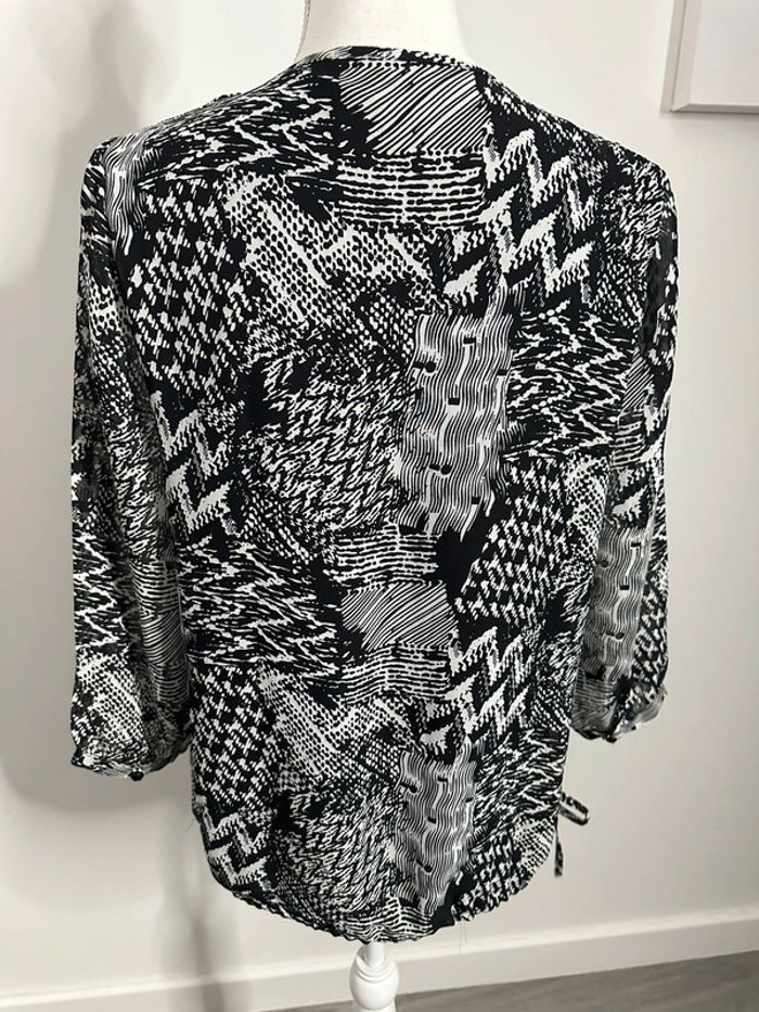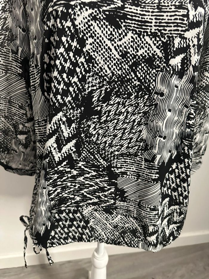 Blouse bariolée - Excellent état - Taille 38 équivalent M - Noire et blanche - Doublure intérieure - Imprimés bariolés et pied de poule - Manches 3/4 - À resserrer sur le bas avec un lien - 100% Polyester