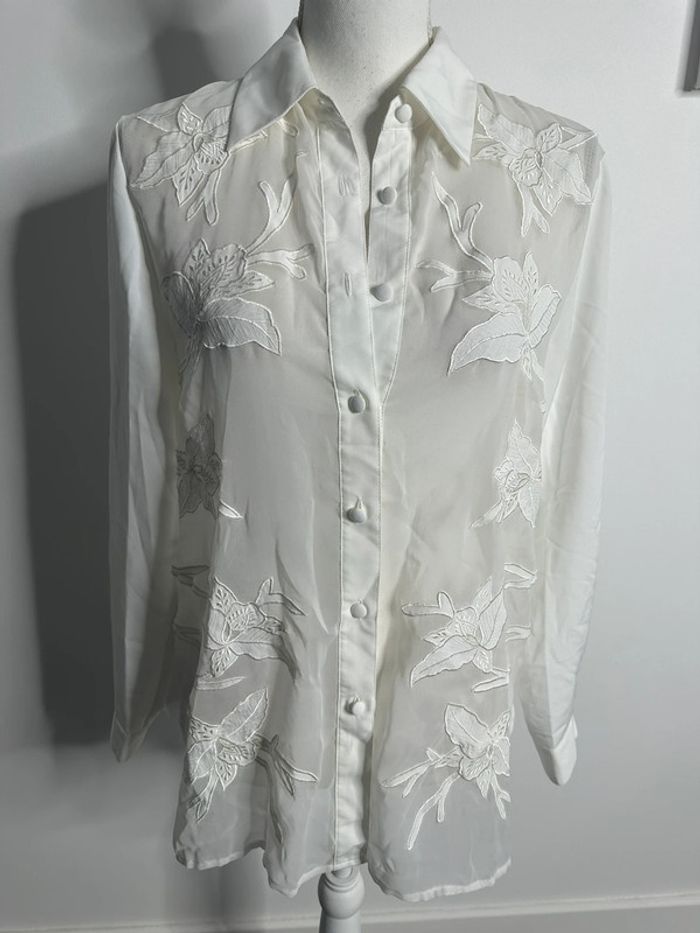 Chemisier - Excellent état - Taille 38 équivalent M - Couleur blanche - Anne Weyburn Vintage - Se ferme avec des boutons - Manches longues - Fleurs brodées à l’avant - Effet de transparence à l’avant - 100% Polyester