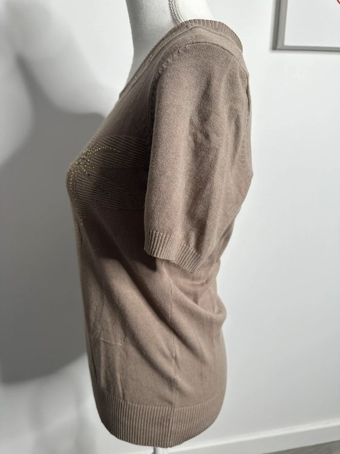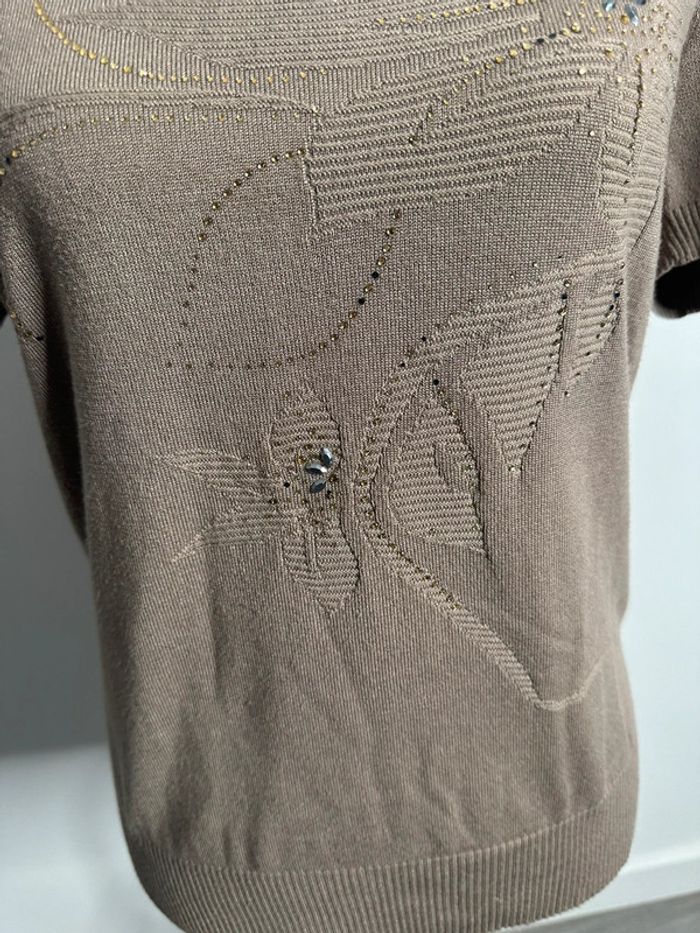 T-shirt à fleurs - Excellent état - Taille 38/40 équivalent M/L - Marque Damart - Couleur taupe, argenté et doré - Imprimés fleurs et strass argentés et doré à l’avant - Détails broderies au niveau du col - Il manque quelques strass (voir photo) - Viscose et polyamide