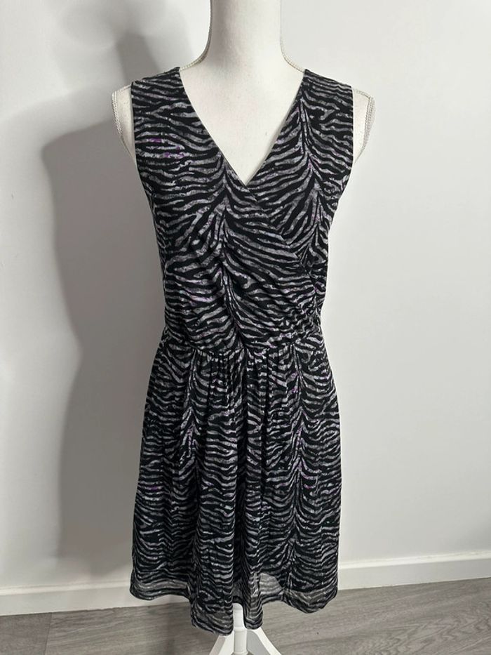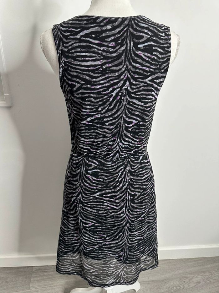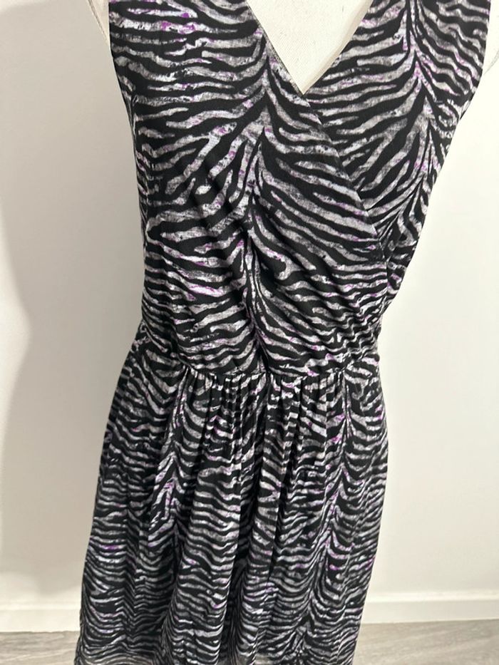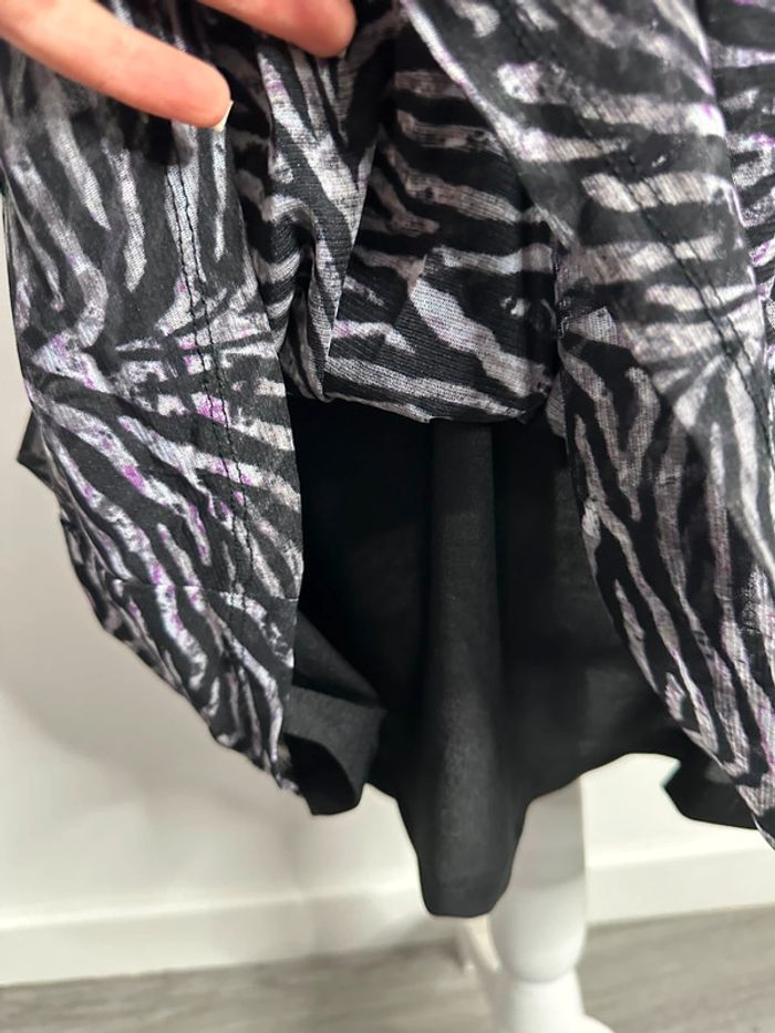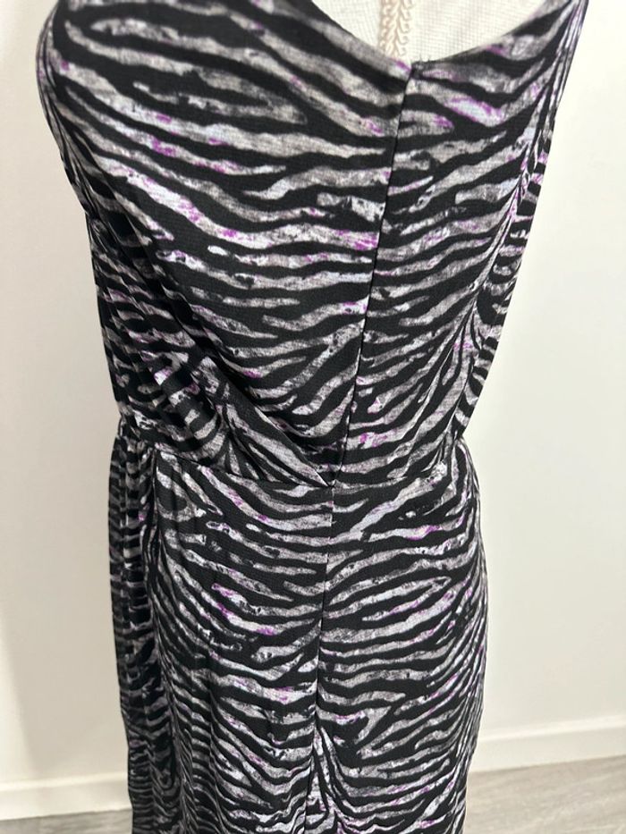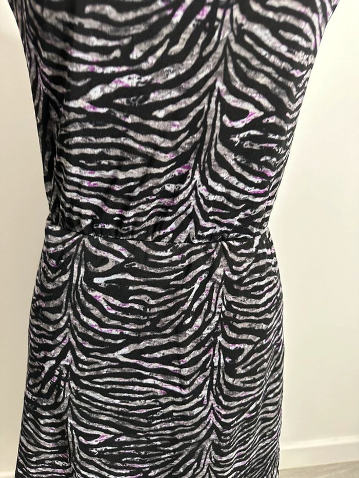 Robe zébrée - Excellent état - Taille 38 équivalent M - Noire grise et violette - S. Oliver - Drapée a l’avant - Élastique à la taille - Doublure intérieure - Imprimés zèbre - Plus d’étiquette de taille
