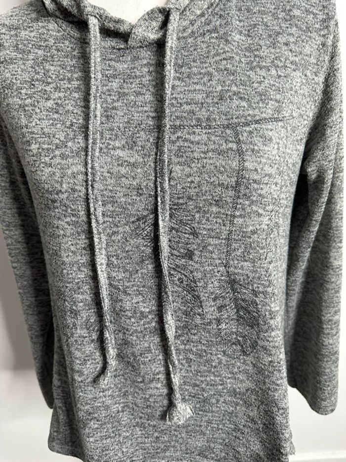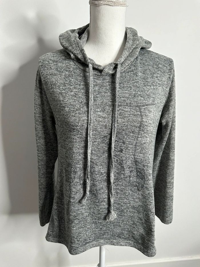 Sweatshirt à capuche - Excellent état - Taille 38 équivalent M - Gris moucheté - Viscose et élastane - À capuche - Fabrication italienne 🇮🇹 - Imprimés plumes à l’avant