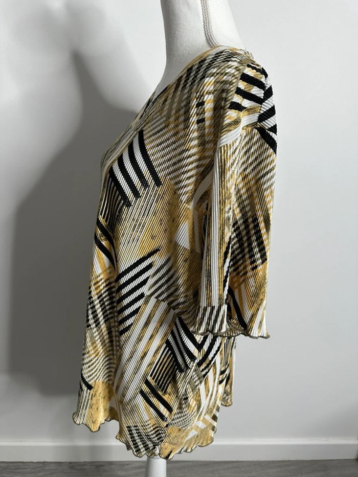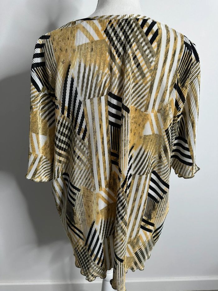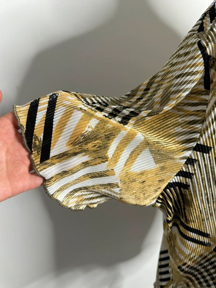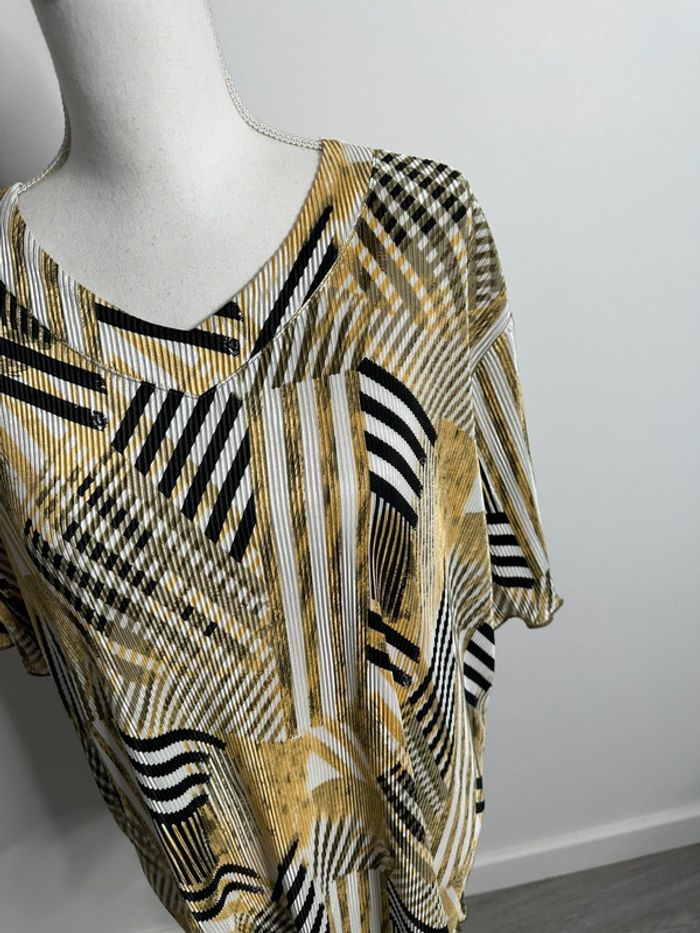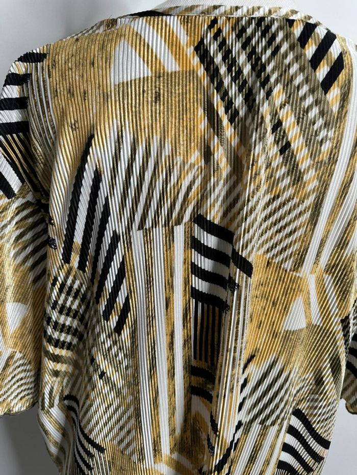 Blouse plissée oversize - Excellent état - Taille 42 équivalent XL - Noire blanche et dorée - Malva Vintage, années 90’ - Manches courtes - Col en V - 100% Polyester